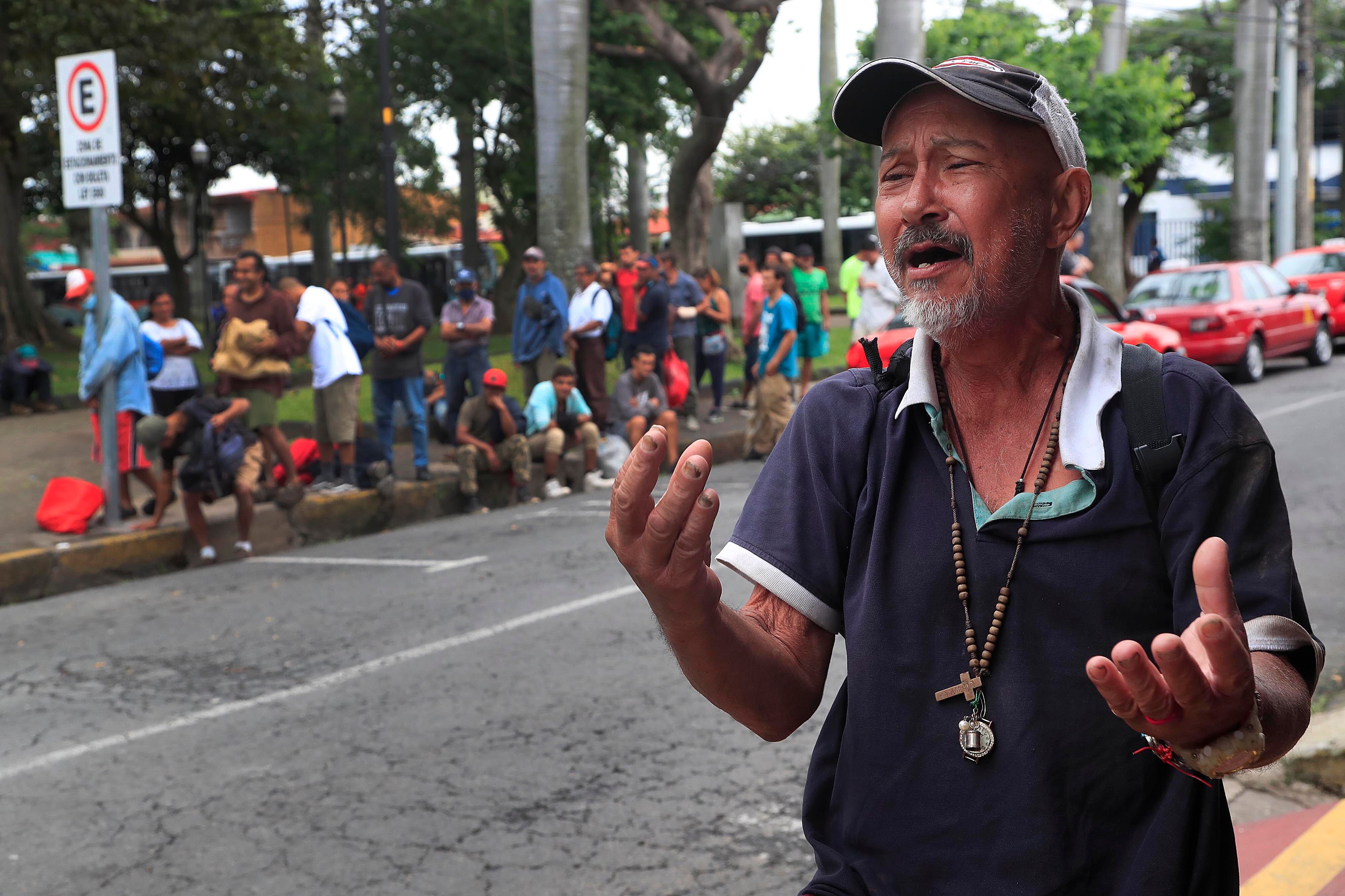 El primero en bajarse es un hombre, quien lleva puesta una camiseta roja con un logo que dice “Arroz con mango”. Se trata de Ciro Campos, un alajuelense de 62 años que camina con cierta rapidez hasta donde se encuentra la gente y comienza a saludarles.