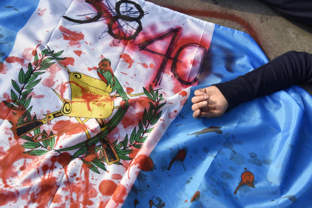Afuera de la Casa Presidencial, cuelga un letrero que reza: "Guatemala no es seguro".