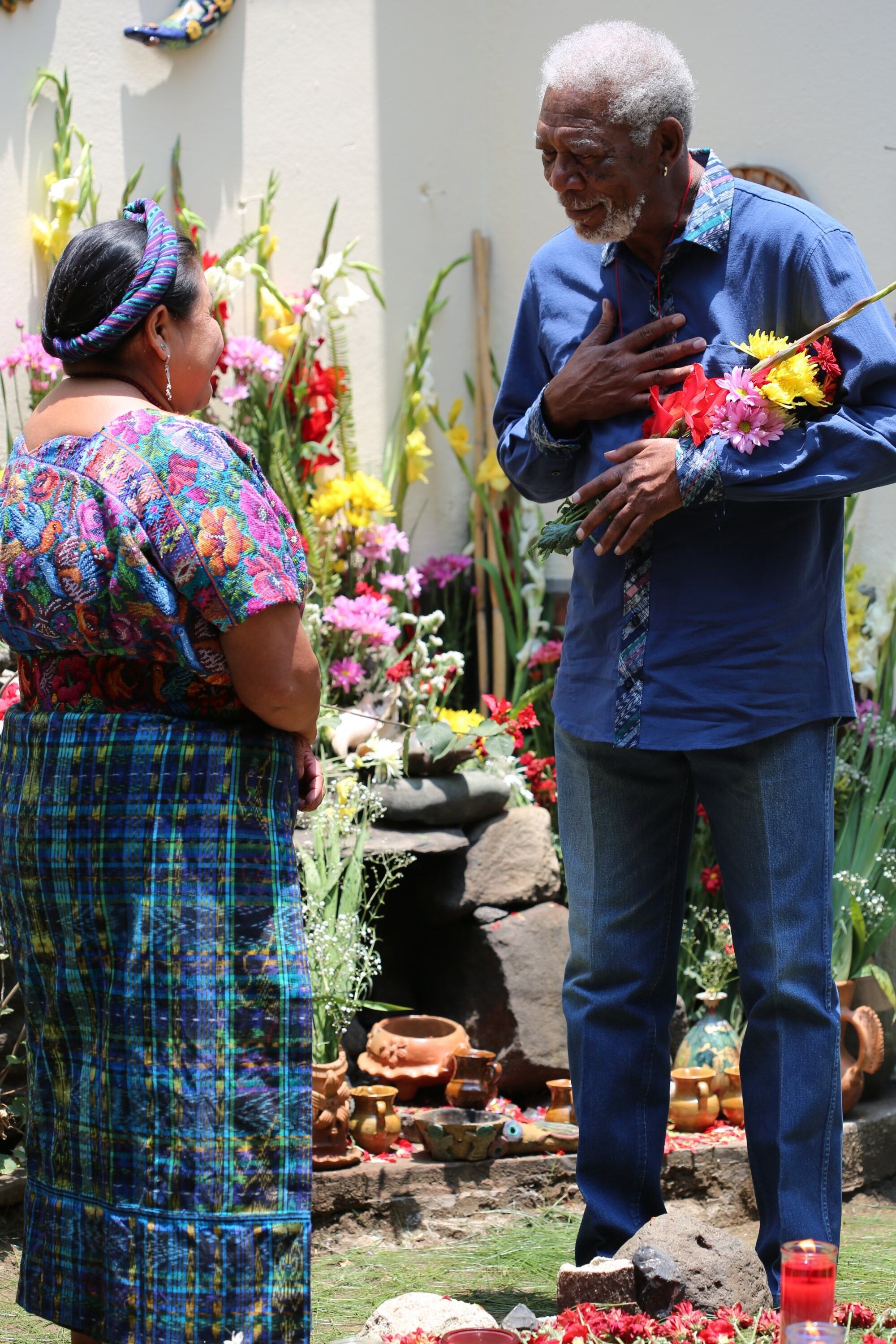 —Hay algo que me gustaría compartir. Hace años yo estaba en Venezuela y soñé con que el señor Morgan entró por una puerta. Me quedé con un impacto enorme. Como he dicho ya, soy una admiradora extraordinaria, admiro sus programas, es educativo, es increíble. Ese sueño se lo comenté al señor Morgan aquí en mi casa. También le comenté que era mágico para mí verlo primero en un sueño y después en la casa en un altar sagrado, en un sitio donde los mayas hacemos nuestras ceremonias. Él me dijo algo que me impactó mucho, me dijo: “Rigoberta, somos iguales”. Le miré a los ojos y me quedé muda. No encontraba qué decir. “Somos iguales”. El tema es que para mí hay una mística enorme de triunfo del pueblo negro que combatió el Apartheid, que combatió la discriminación, que enalteció la música, el cine, implementó la capacidad del ser humano de imponerse a la miseria espiritual, la miseria social e individual de otros seres humanos. Para mí es una fuerza muy grande verlo a él. Realmente es una emoción y un privilegio. Es impresionante ver sus ojos y cuerpo entero como una personalidad. Estoy impactada y espero que toda la gente que haya tenido posibilidad de estar cerca de él también tenga en su poder esa fuerza y ánimo que da al estar a su lado. Es una gran ventana él mismo y por qué no decirlo: National Geographic es inmensamente grande y son millones de millones de personas a las que va a impactar.
