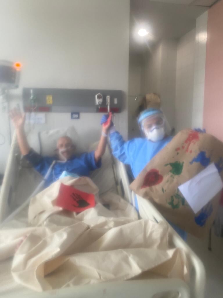 Un señor mayor que estaba muy mal, casi no podía respirar, era candidato a usar un respirador. Luego de varios días internado pudo hablar por videollamada con su esposa, con la que tiene 49 años de casado.