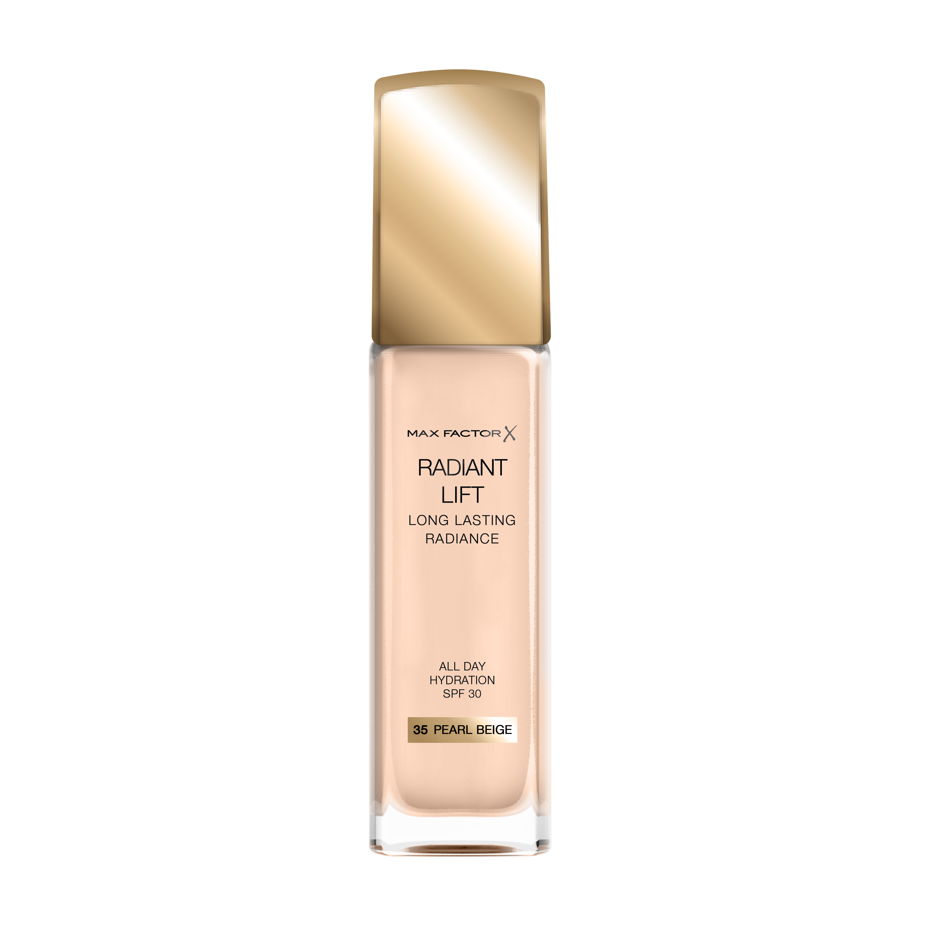 Paso 1: Base. El primer paso es aplicar una base sobre la piel limpia, para darle uniformidad al tono y disminuir la apariencia de los poros abiertos. La base de Radiant Lift de Max Factor utiliza una infusión de microperlas que suavizan la piel para reducir la aparición de líneas finas y reflejar la luz. Además, da un toque natural y a la vez es de larga duración.