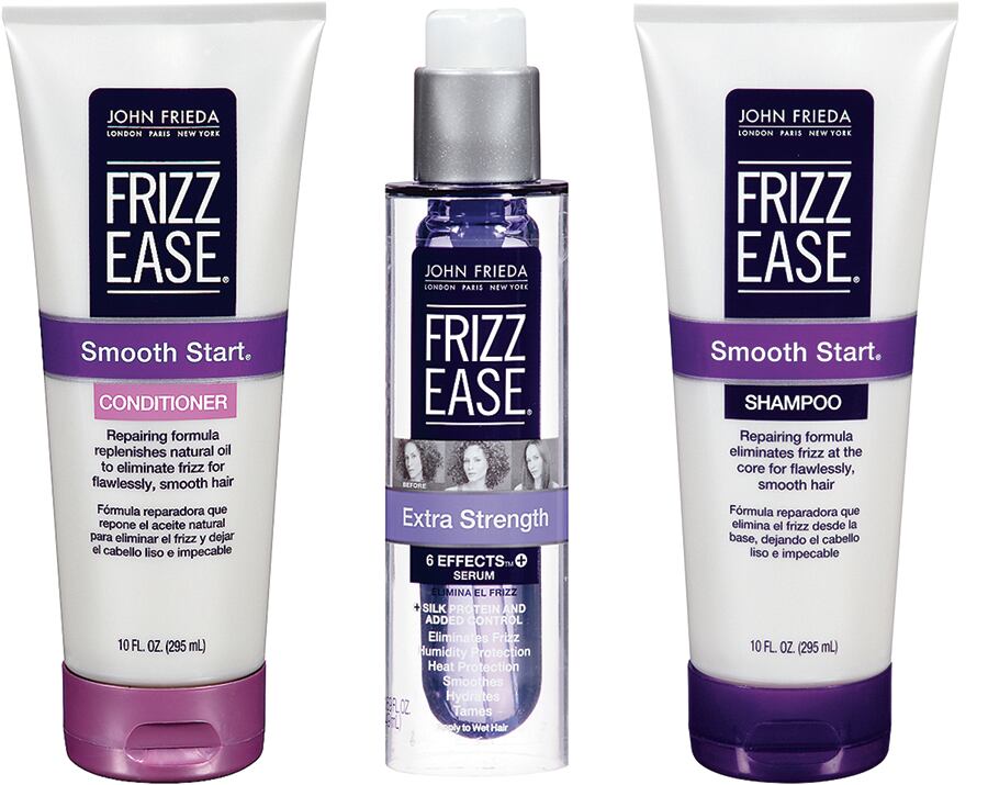 Para el cuidado cotidiano, use productos para cabello seco; por ejemplo: el shampú y el acondicionador Smooth Start Flawlessly Straight y el serum Extra Strength, ambos de la marca John Frieda.
