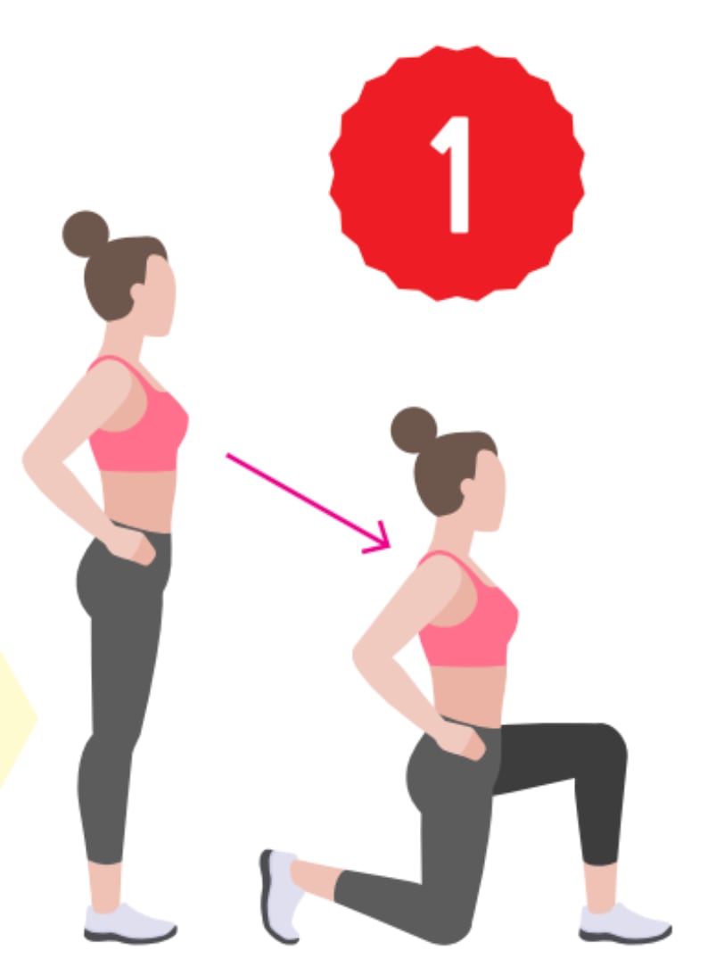 1. Desplantes alternados al frente: De pie, desplace una pierna hacia delante; asegúrese de que su rodilla no sobrepase la punta del pie. Con la espalda recta, concentre el trabajo en piernas y glúteos.