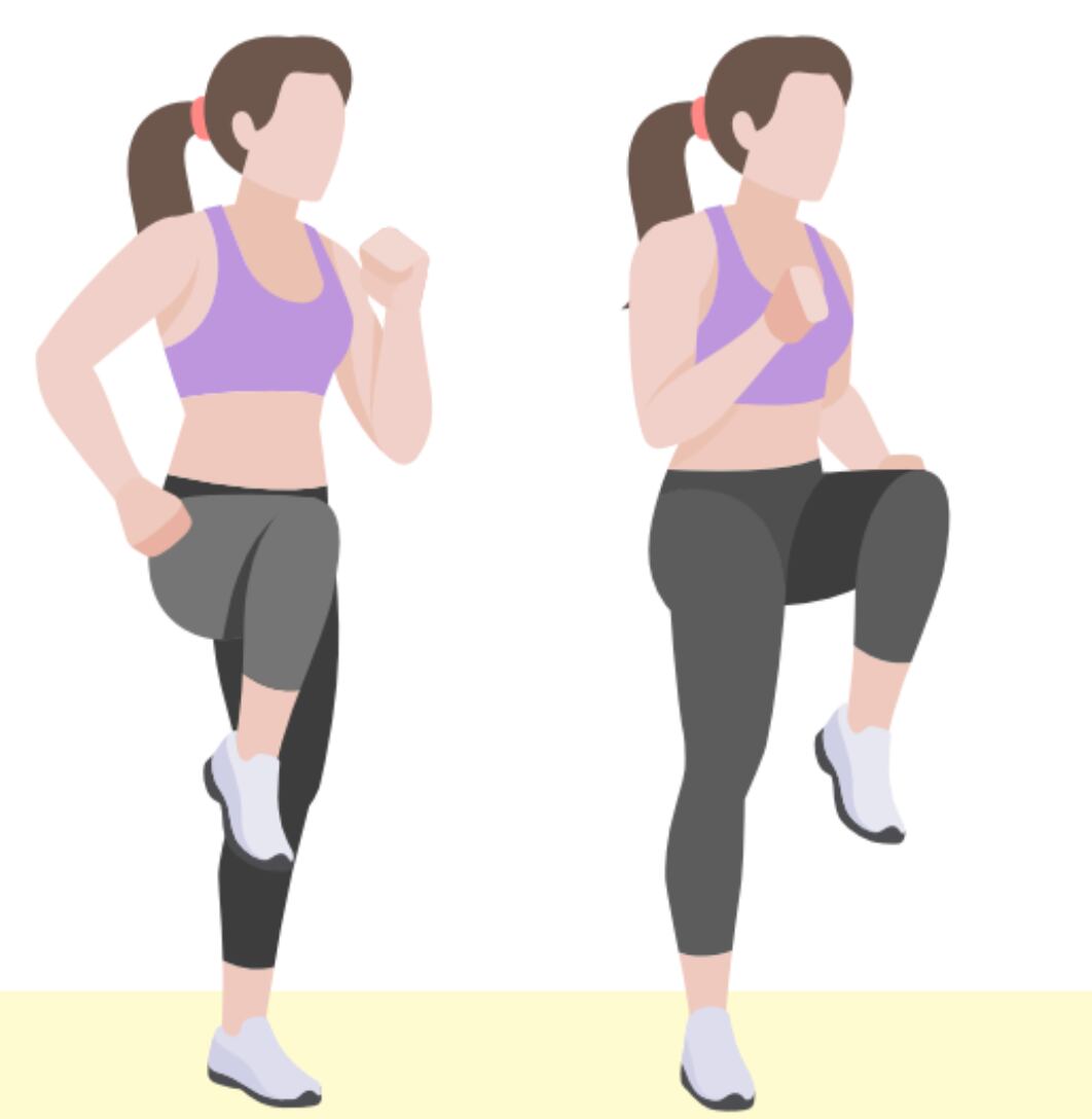 8. Rodillas alternadas: De pie, alterne rápidamente las piernas sin perder el contacto del suelo. Las rodillas deben llegar aproximadamente a la altura del ombligo.