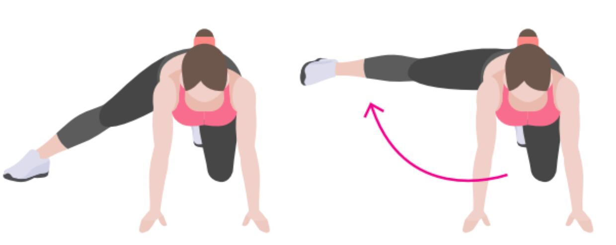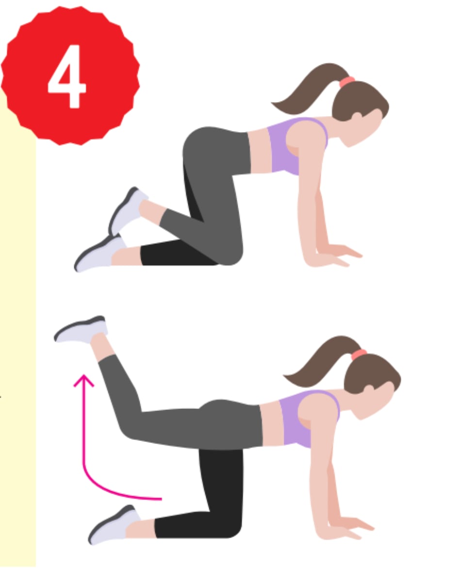 4. Extensión de cadera glúteos: Inicie en posición cuadrúpeda, mueva el pie de manera recta empujando hacia arriba. Tense la zona abdominal y los glúteos al subir.