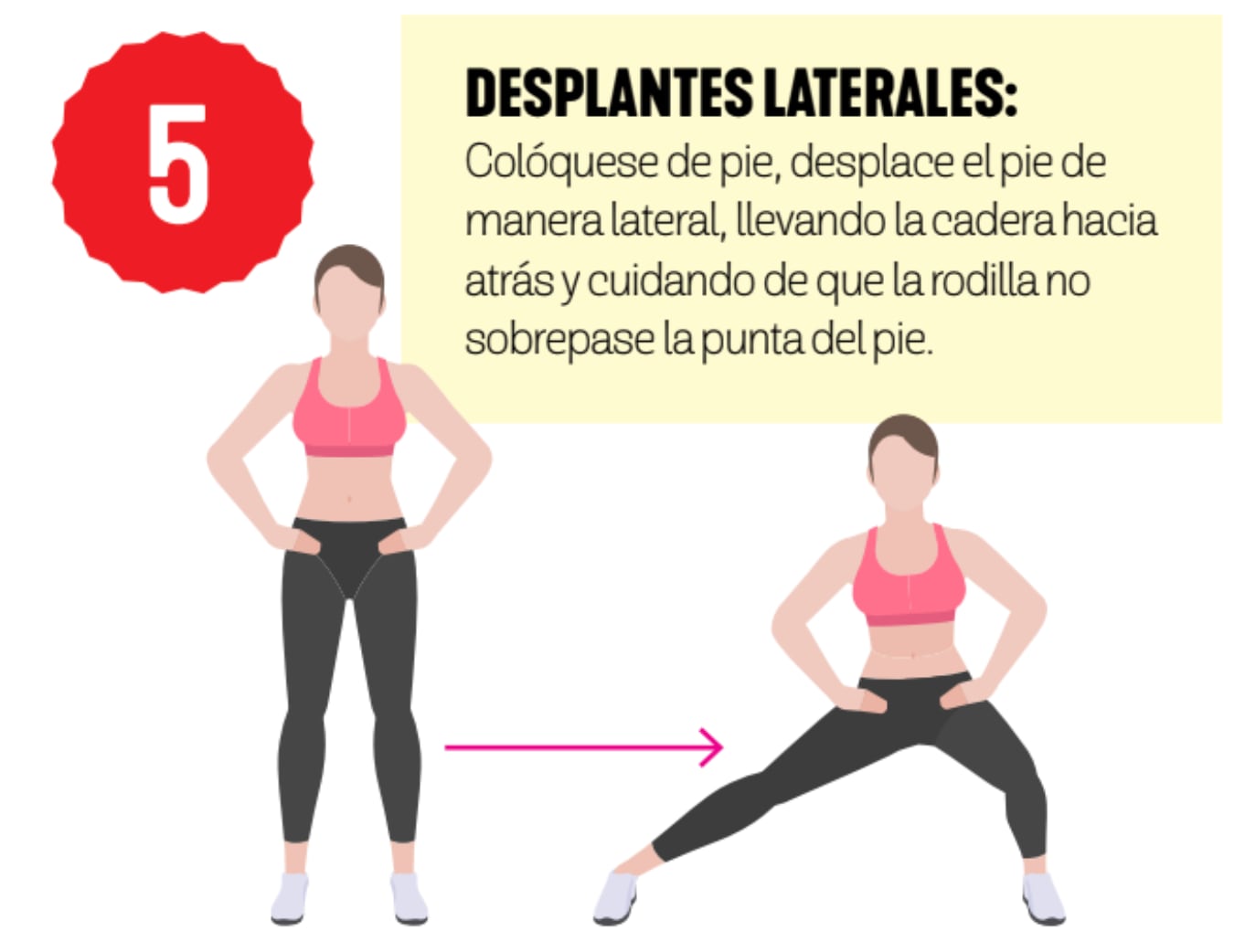 5. Desplantes laterales: Colóquese de pie, desplace el pie de manera lateral, llevando la cadera hacia atrás y cuidando de que la rodilla no sobrepase la punta del pie.