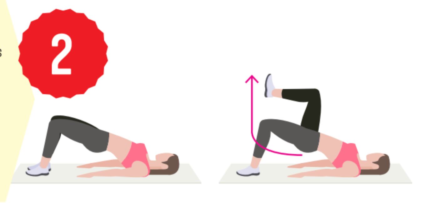 2. Puente individual: Acuéstese boca arriba, acerque los talones al glúteo y suba la cadera. Luego, manteniendo el equilibro, coloque una pierna flexionada en 90 grados, sin tocar el piso. Tense la zona abdominal y el glúteo de la pierna que está anclada.