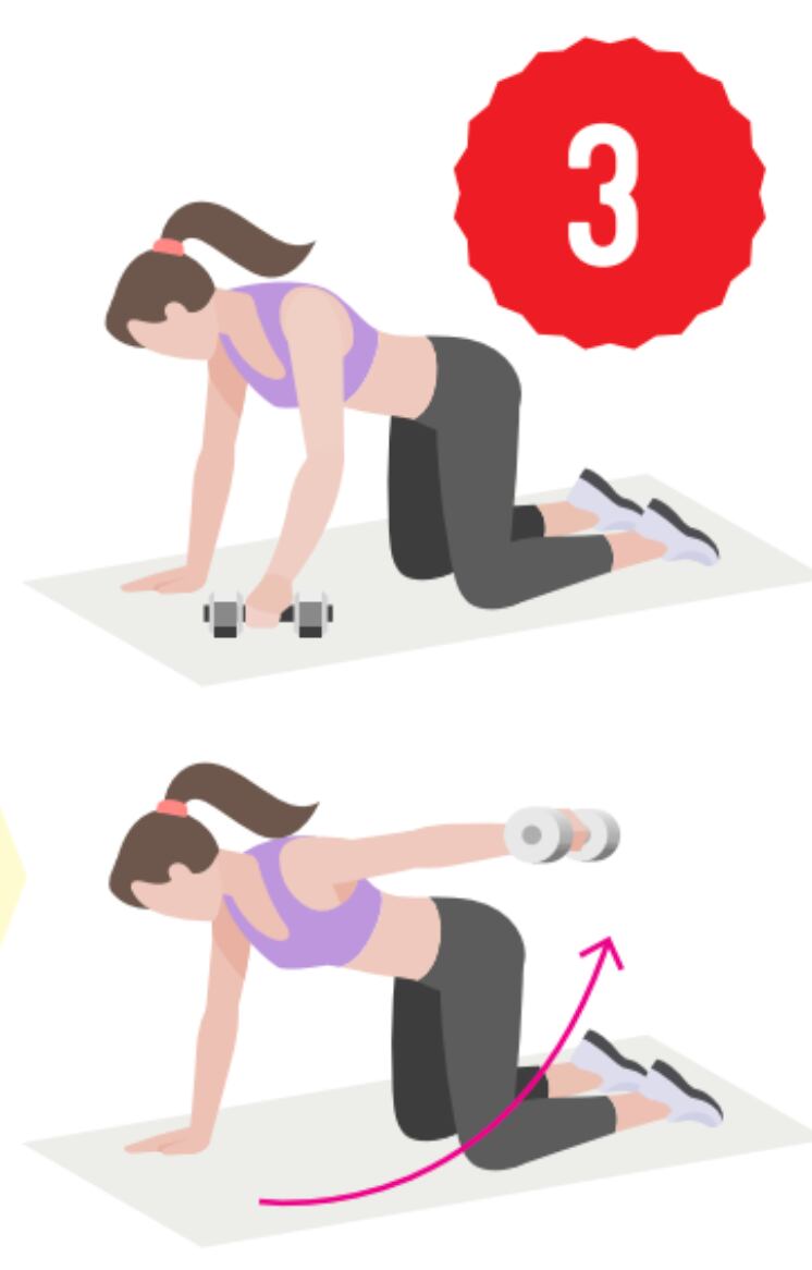 3. Laterales individuales hombros: Colóquese en posición cuadrúpeda, mueva de manera lateral el brazo en línea con el hombro. Tensando la zona abdominal para mantenerla estable, concentre el trabajo en el hombro.