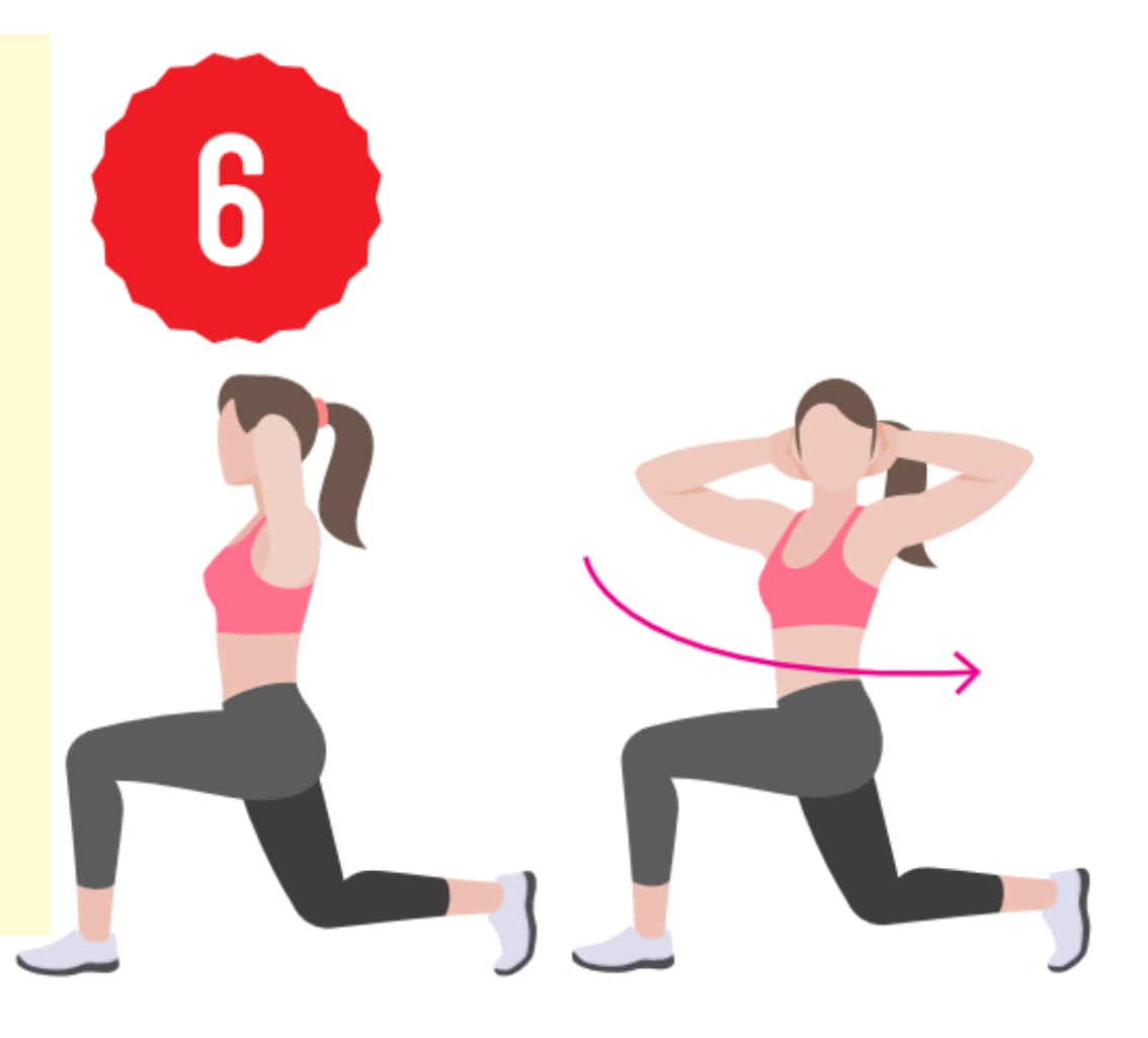 6. Desplantes alternados con rotación de tronco: Realice los desplantes como en el ejercicio n.º 1, pero ahora rote el tronco ligeramente y coloque tensión en la zona abdominal.