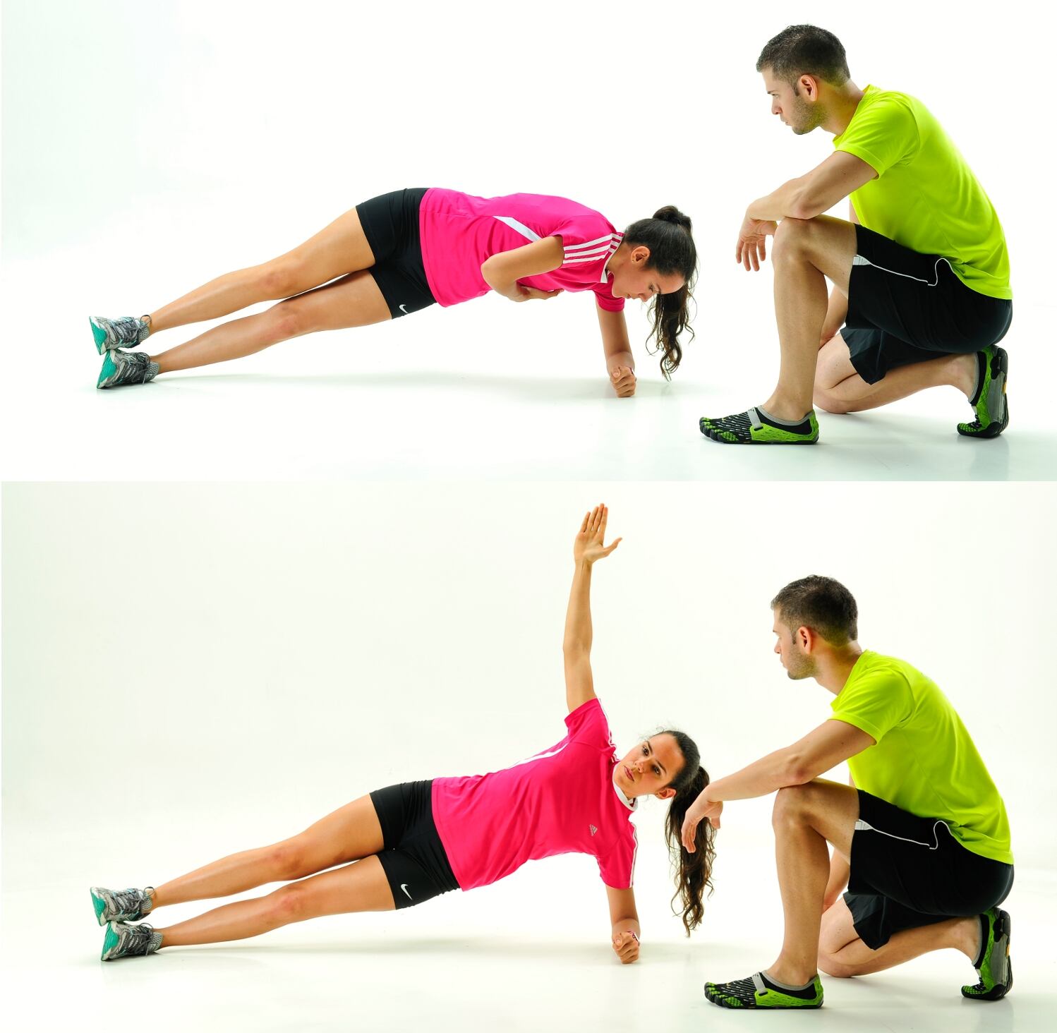 Acuéstese de costado con el abdomen y los glúteos contraídos y apoye su antebrazo en el sueño. Levante la cadera de tal manera que siempre esté en línea con los hombros y los tobillos. Levante el brazo que tiene libre y gire la espalda hacia adentro. Cuide que su mirada vaya al frente y tenga el cuello recto durante todo el movimiento.
