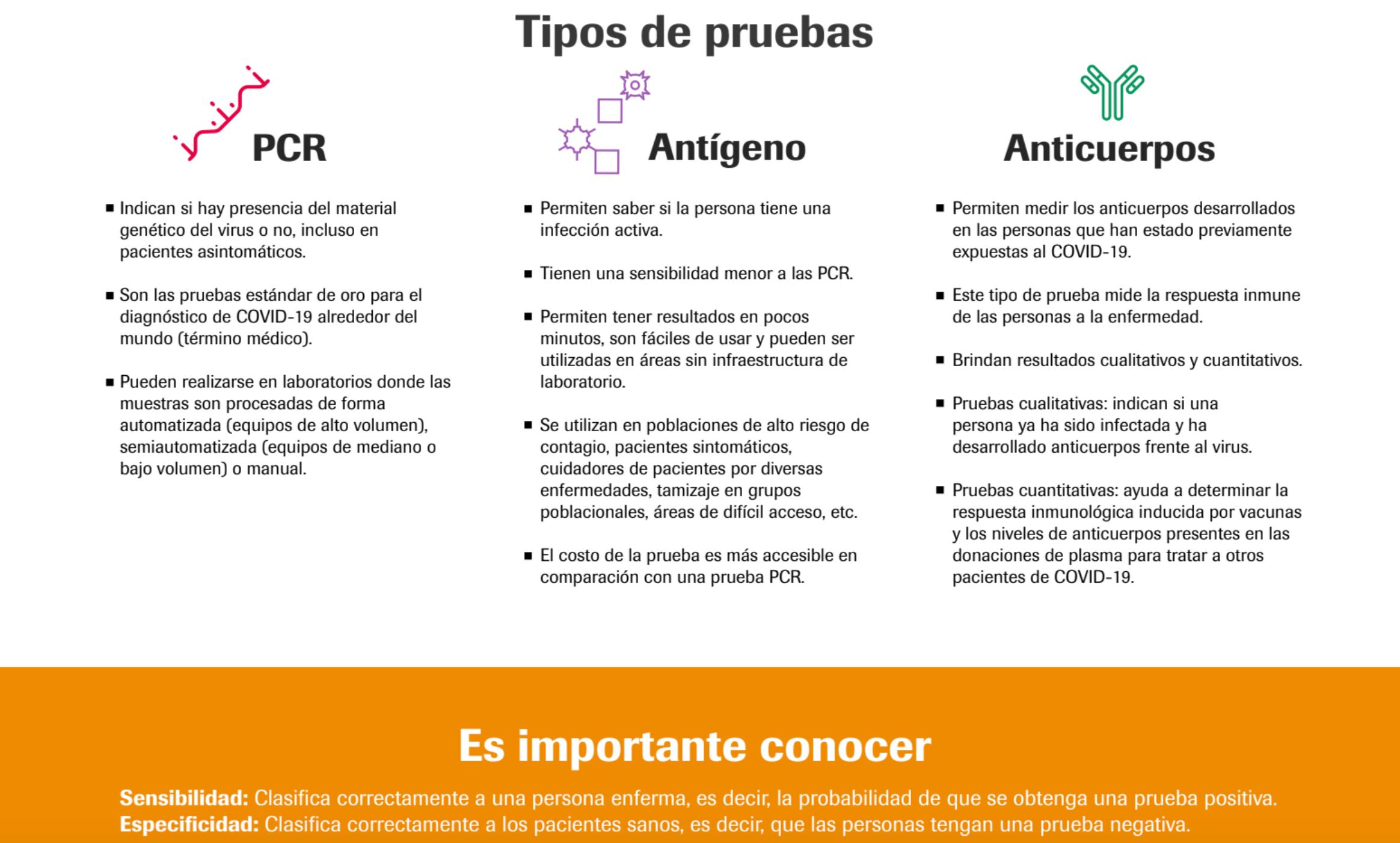 También, es importante conocer que el “nivel de sensibilidad” de las pruebas se refiere a su capacidad de clasificar correctamente a una persona enferma, es decir, la probabilidad de que se obtenga una prueba positiva; por ejemplo, entre más sensible y mayor carga viral tenga la persona será más fácil diagnosticarla. Mientras, la “especificidad” se refiere a la capacidad de la prueba de clasificar correctamente a los pacientes sanos, es decir, que las personas tengan una prueba negativa.
