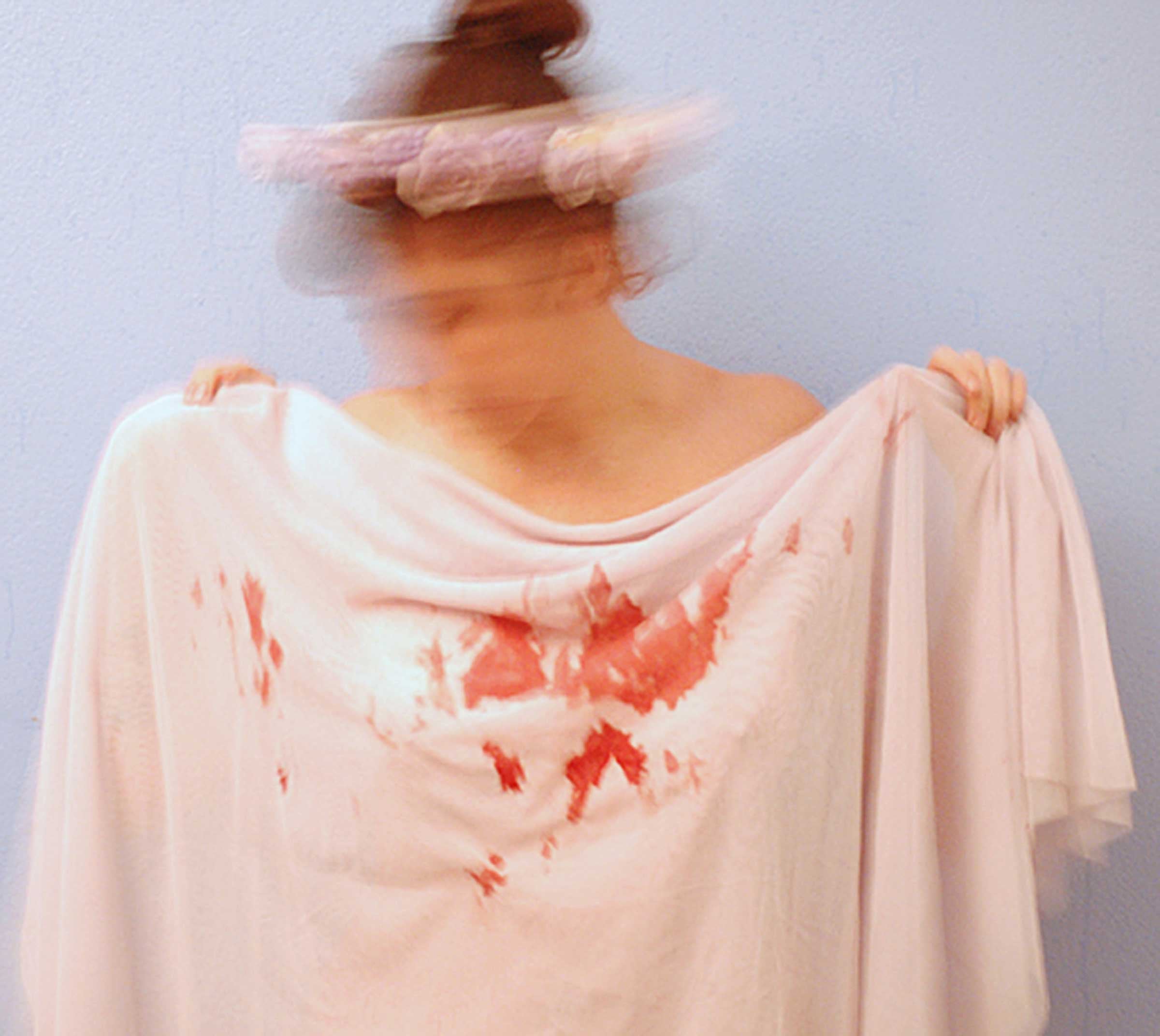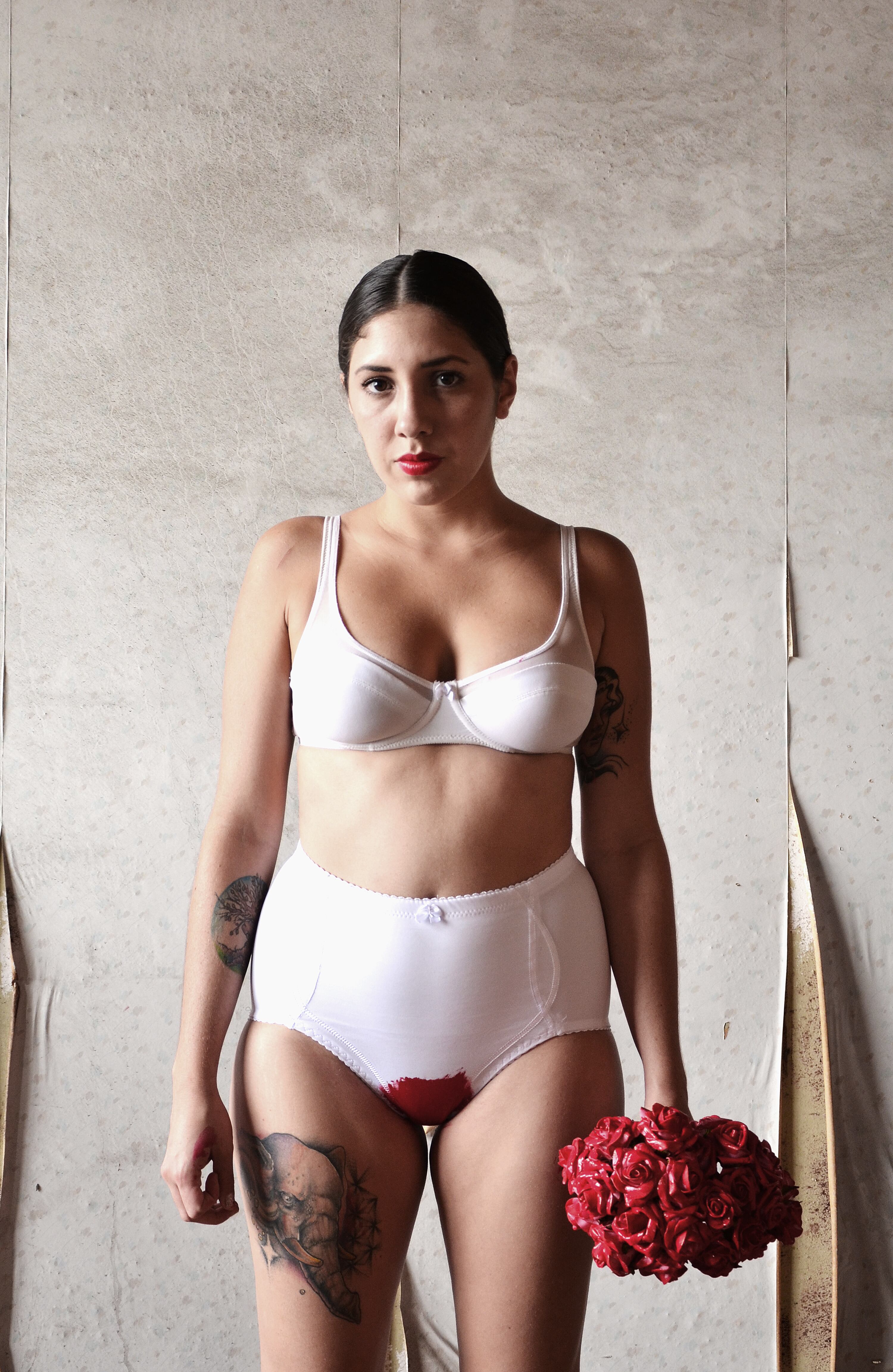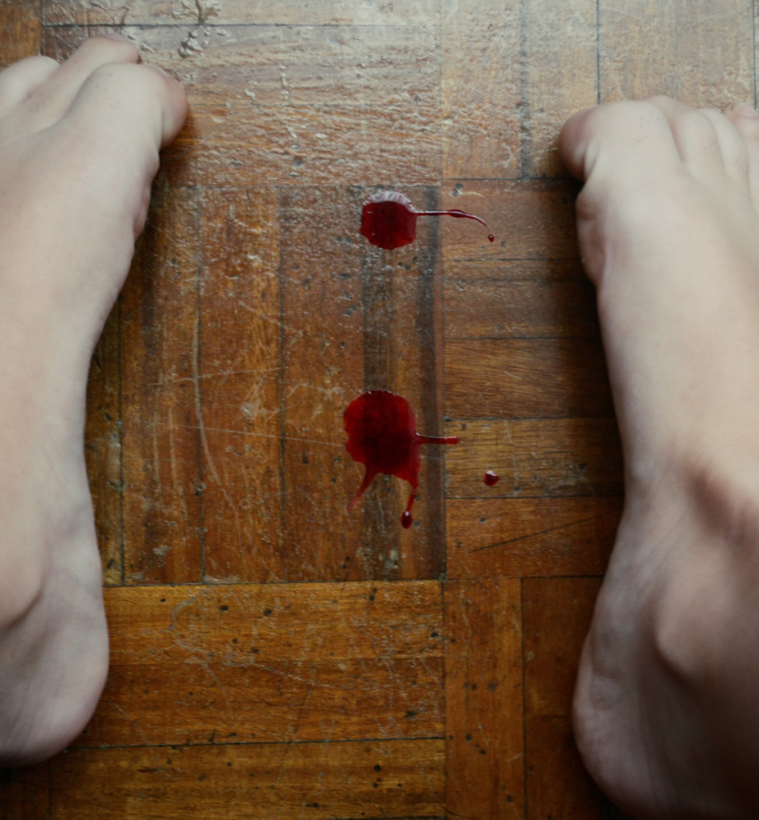 Un día, a mis 22 años, caminaba desnuda por mi cuarto y cayeron dos gotas de sangre al piso de madera. Me quedé observándolas y las fotografié, con mis pies descalzos bordeándolas. Decidí explorar más. Introduje mi dedo medio en la vagina y le tomé fotografías cubierto de sangre.