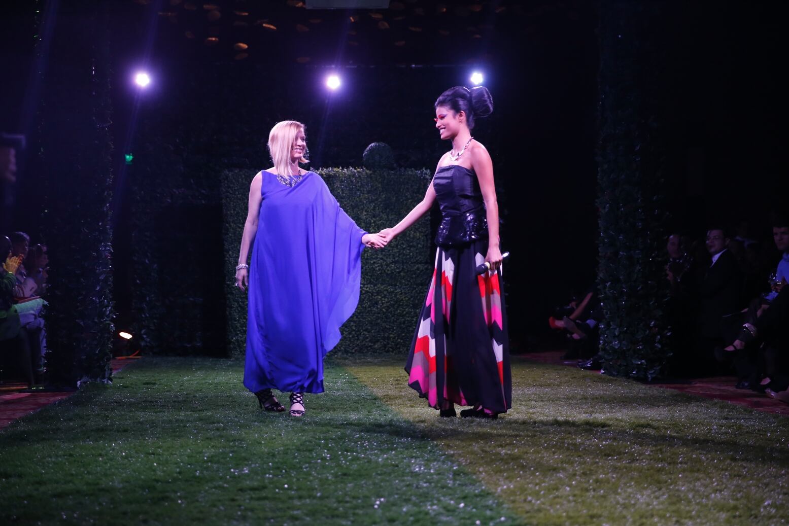 En Trinos las modelos desfilaron por una pasarela que se vistió de un inmenso jardín tropical y mostraron conjuntos en los que abunda la seda, el chifón, el cuero italiano y, en el caso de la joyería, plata 925 reciclada, que se une con piedras semipreciosas y enchapes de plata u oro.