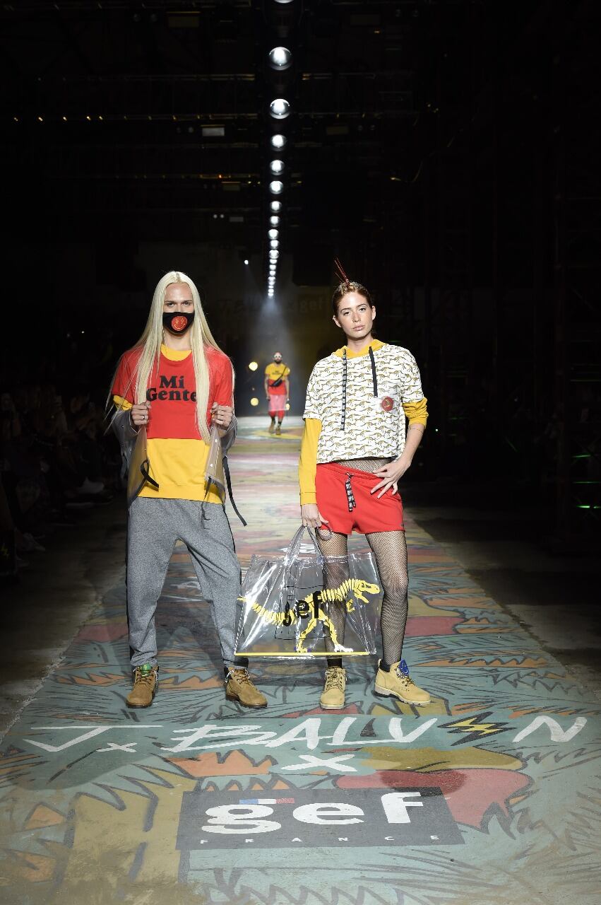 Un galerón convertido en anfiteatro urbano, en cuyas paredes se leía la frase “J. Balvin x GEF”, el cemento de la pasarela replicaba el diseño de sus caritas felices, los rayos, los dinosaurios (que también estaban a gran escala).