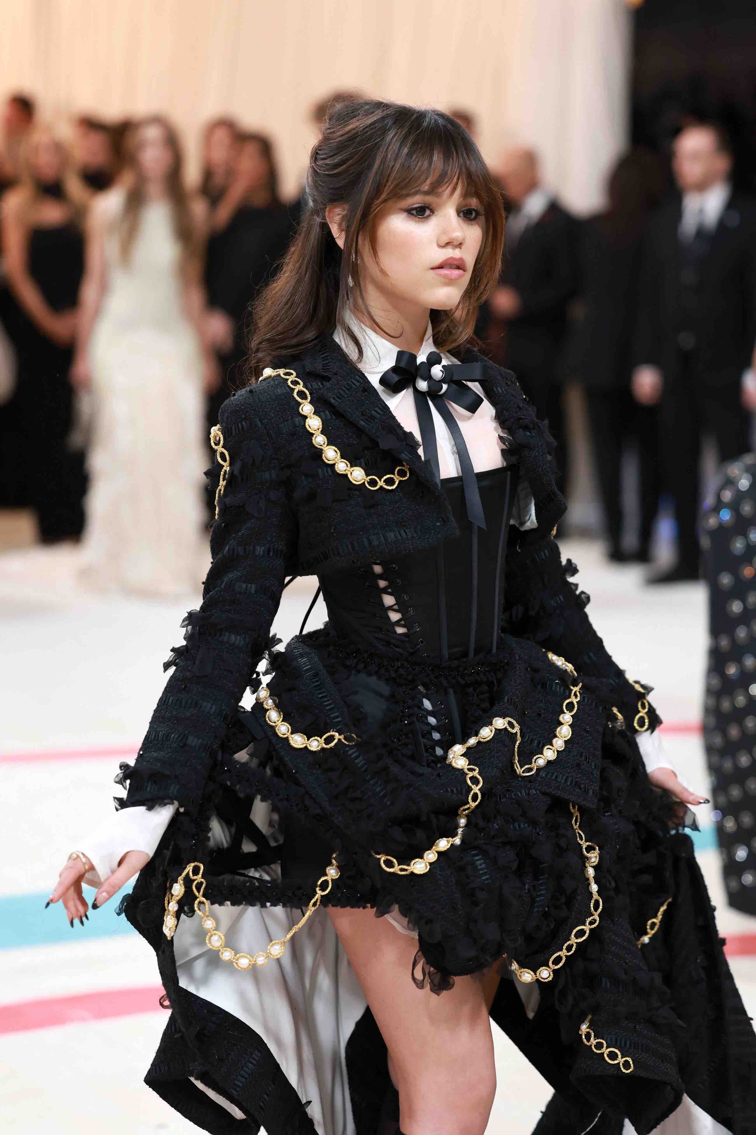 Jenna Ortega: En un vestido del diseñador Thom Browne, la nueva it girl del momento deslumbró en la alfombra haciendo homenaje al trabajo de Lagerfeld con algunos de sus característicos elementos tales como el tweed, las cadenas, las perlas y por supuesto el blanco y negro.