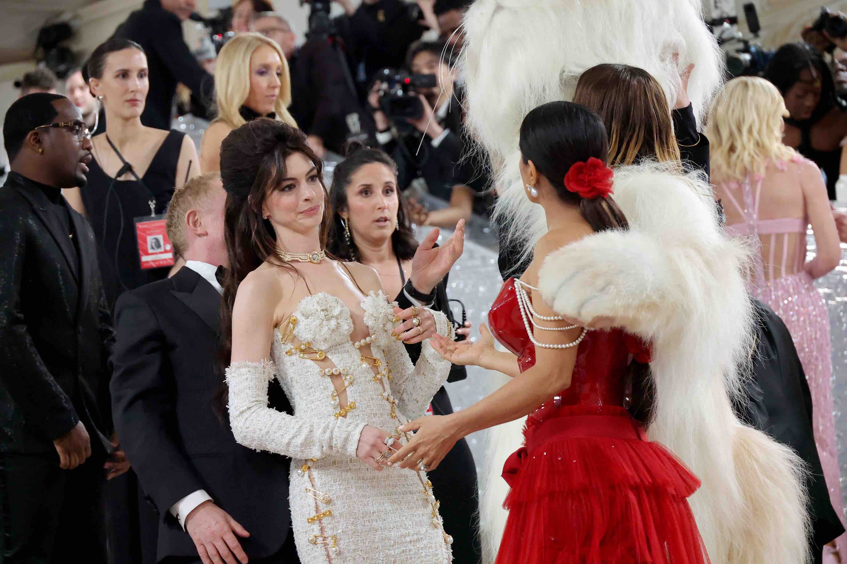Anne Hathaway: De la mano de Donatella Versace, Anne Hathaway vistió un hermoso vestido que rindió homenaje al diseñador alemán sin dejar de lado la esencia Versace, entremezclando perfectamente el icónico tejido tweed y las perlas características de Chanel, junto con los broches dorados de Versace.