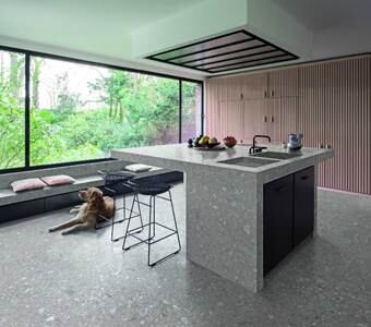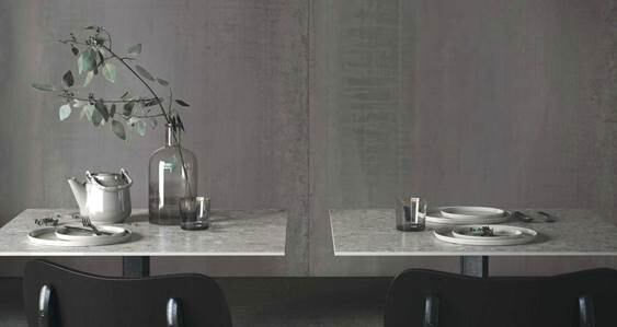 Esta tendencia destaca el encanto mineral de los metales en dos coloraciones de sugestiva superficie tornasolada. Las placas de medidas grandes amplían las posibilidades de ejecutar proyectos en los que no se interrumpe la continuidad. Además, brinda las condiciones ideales para crear infinitas composiciones de formas y atractivas soluciones decorativas, como mesas y encimeras de cocina.