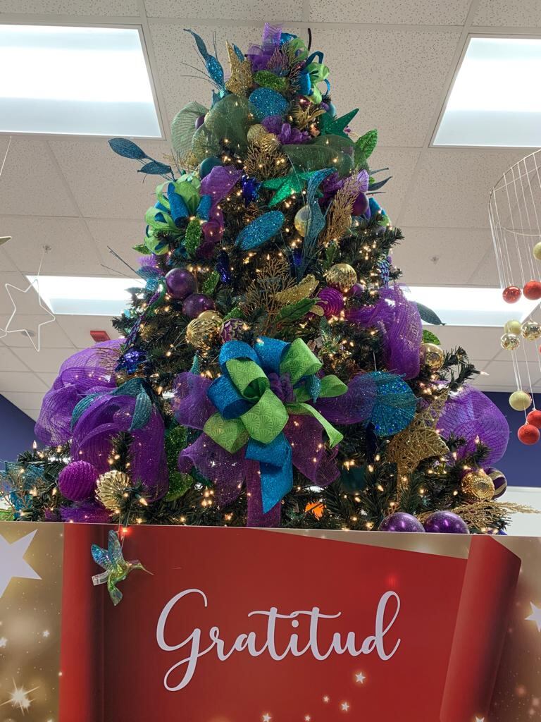 Gratitud: Exóticos tonos verdes, turquesas y morados se funden, en un estilo llamativo esta Navidad reflejando a través de sus exuberantes colores, un encantador paraíso festivo que creará un entorno navideño lleno de vida. Buscamos inspirar un sentimiento de agradecimiento y sinceras promesas para el año que viene.