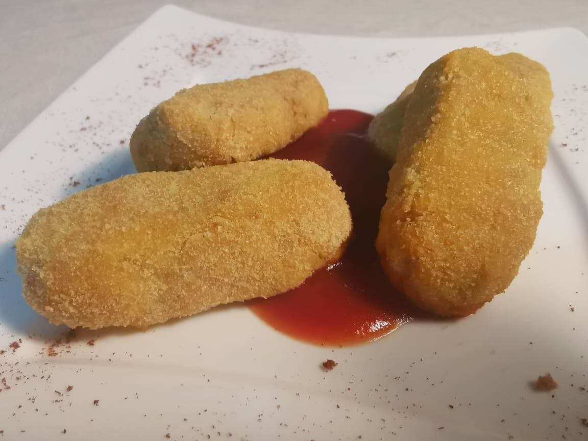 Le damos forma de deditos y los pasamos por pan molido. Lo ponemos en nuestra freidora de aire por 5 minutos, le damos vuelta y ponemos otros 5 minutos.