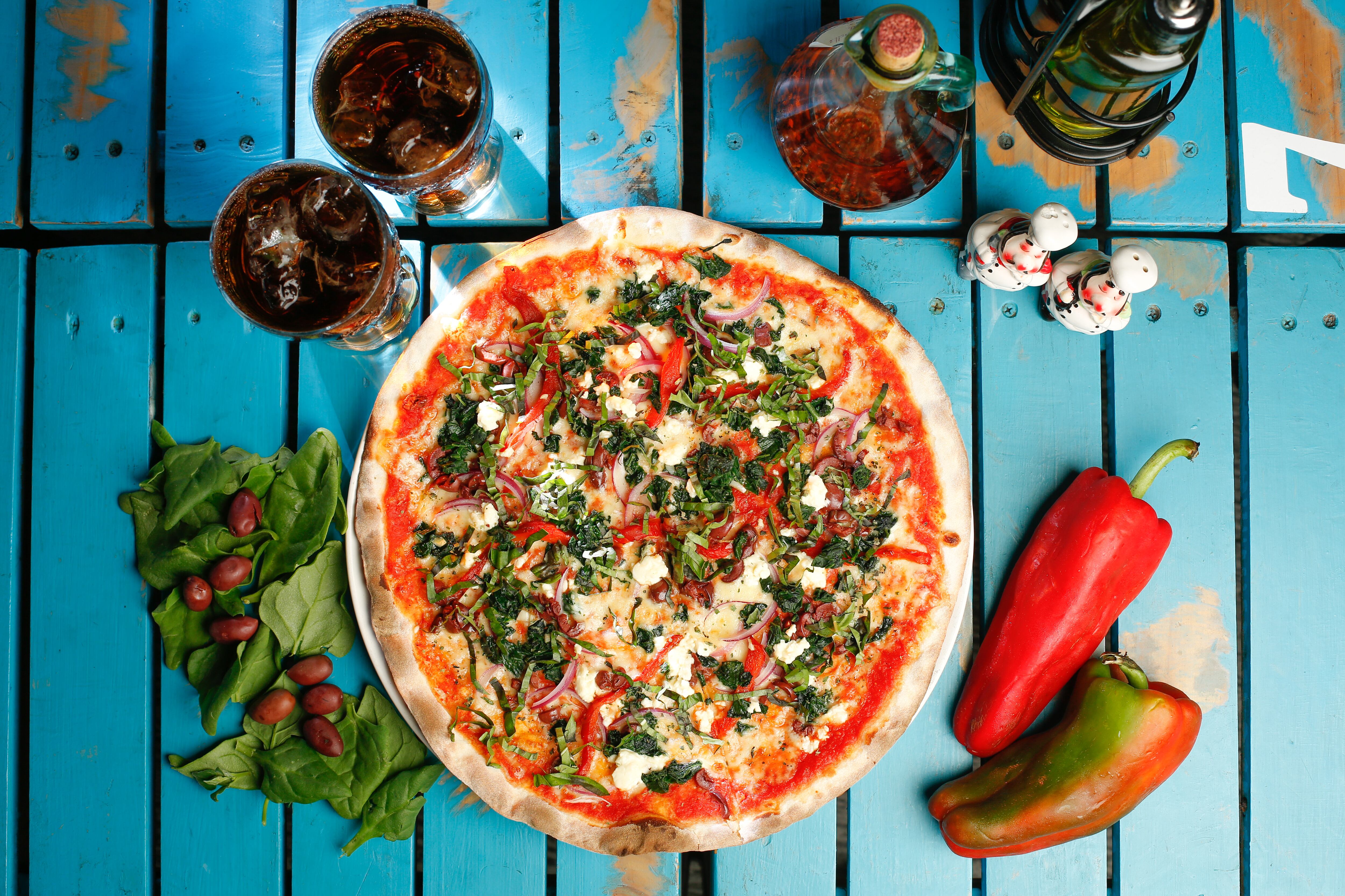 #PIZZAVEGGIELOVERS. Pasta delgada y crujiente, hecha a mano en nuestro horno de leña, lleva una deliciosa salsa roja a base de tomates rostizados, mozzarella fresca, chiles asados, aceituna kalamata, espinaca salteada con ajo y queso feta con albahaca.