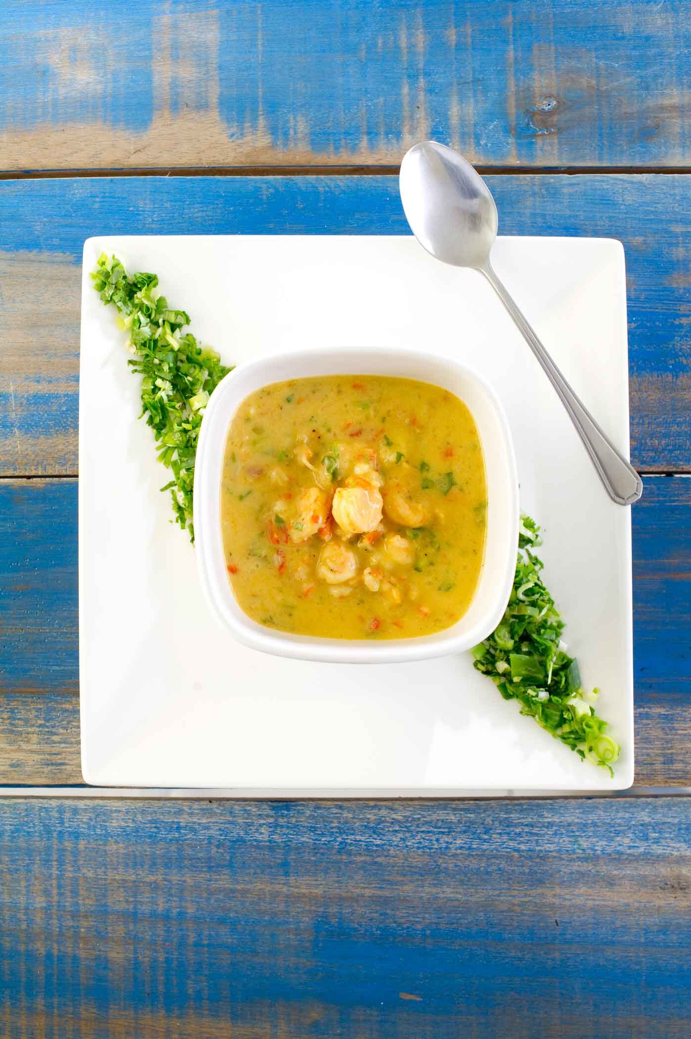 Sirva en un plato sopero, acompañado con arroz blanco, los cebollines picados fino por encima, picante al gusto y culantro.