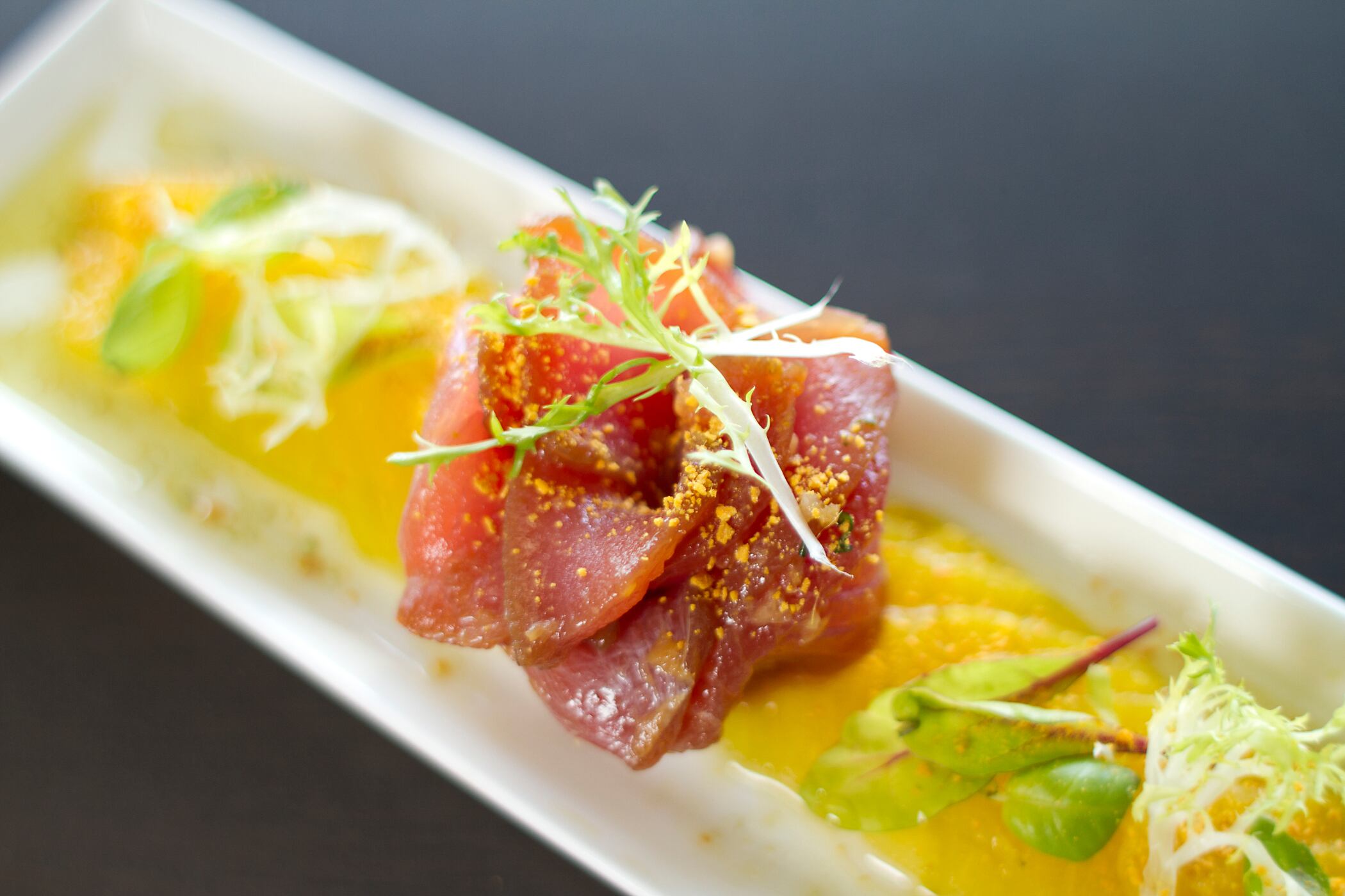 - Se decora con el polvo de pejibaye y queso y un poco del marinado del atún.