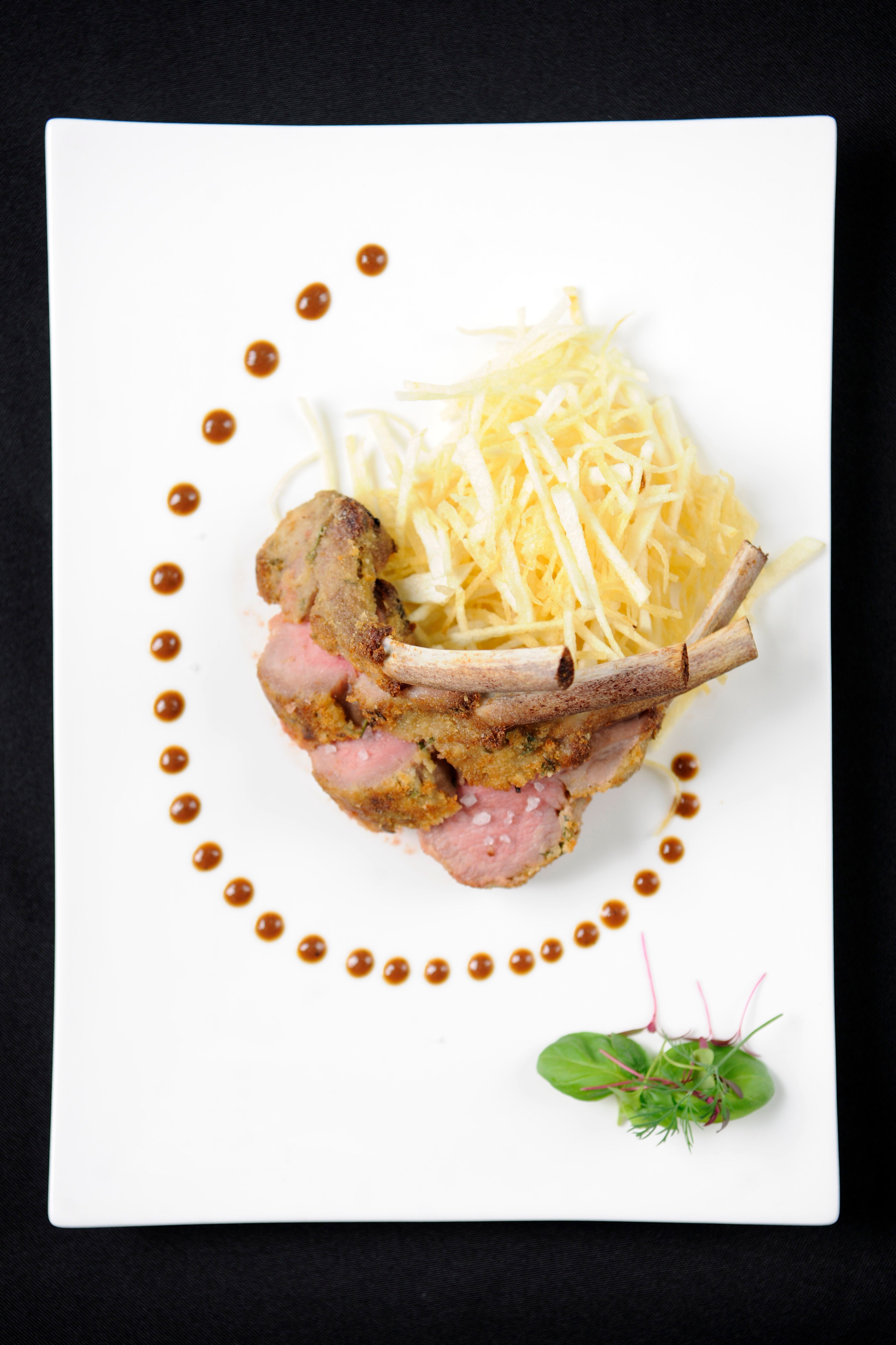 Separe la carne de los huesos sin llegar a cortar del todo y retire la carne que se encuentra entre las costillas hasta que queden bien limpias. Salpimiente y adobe el carré con una cucharada de mostaza. Coloque sobre una bandeja de horno acompañado de orégano. Moje la carne con el vino y hornee a 220º C durante 15 minutos.