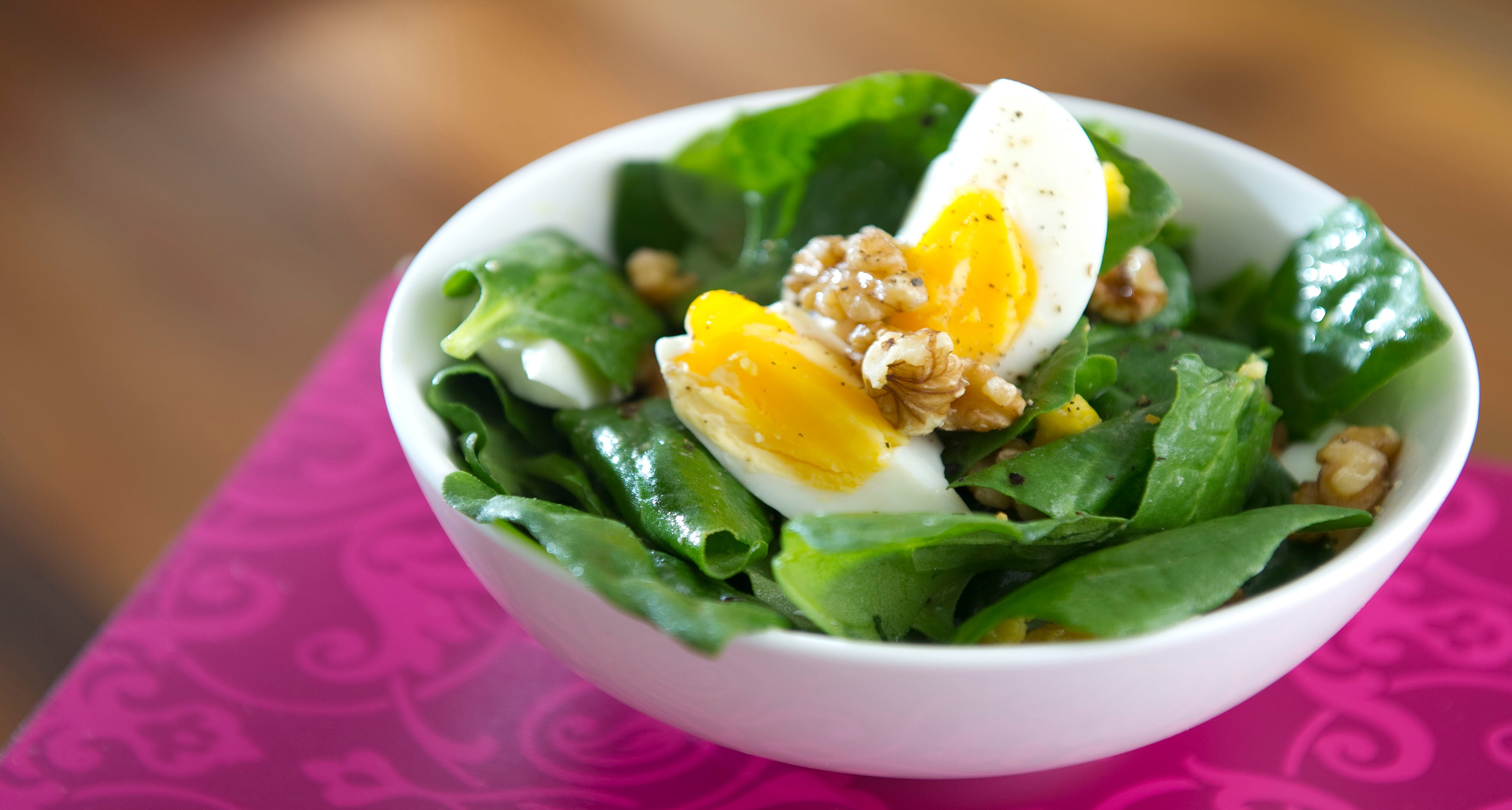 Deshoje las espinacas y lave bien las hojas. Escurra y reserve. Prepare los huevos de ocho minutos: coloque una olla mediana al fuego, llena de agua hasta la mitad. Deje hervir. Al primer hervor, deposite uno a uno los huevos con una cuchara, con cuidado de no quebrarlos. Deje hervir durante ocho minutos para que las yemas queden firmes pero no sobre cocinadas. Deje enfriar unos minutos, pele y corte cada huevo en ocho gajos. Tueste las nueces en una sartén a fuego medio, hasta que las cáscaras comiencen a ennegrecer. Espere a que se enfríen para triturarlas. Para el aderezo, en un tazón pequeño revuelva el vinagre, el azúcar, el aceite y la sal con movimientos enérgicos, hasta obtener una vinagreta homogénea. A la hora de servir, transfiera la vinagreta a un tazón más grande y agregue las espinacas, los huevos y las nueces, y revuelva bien. Agregue pimienta negra al gusto.