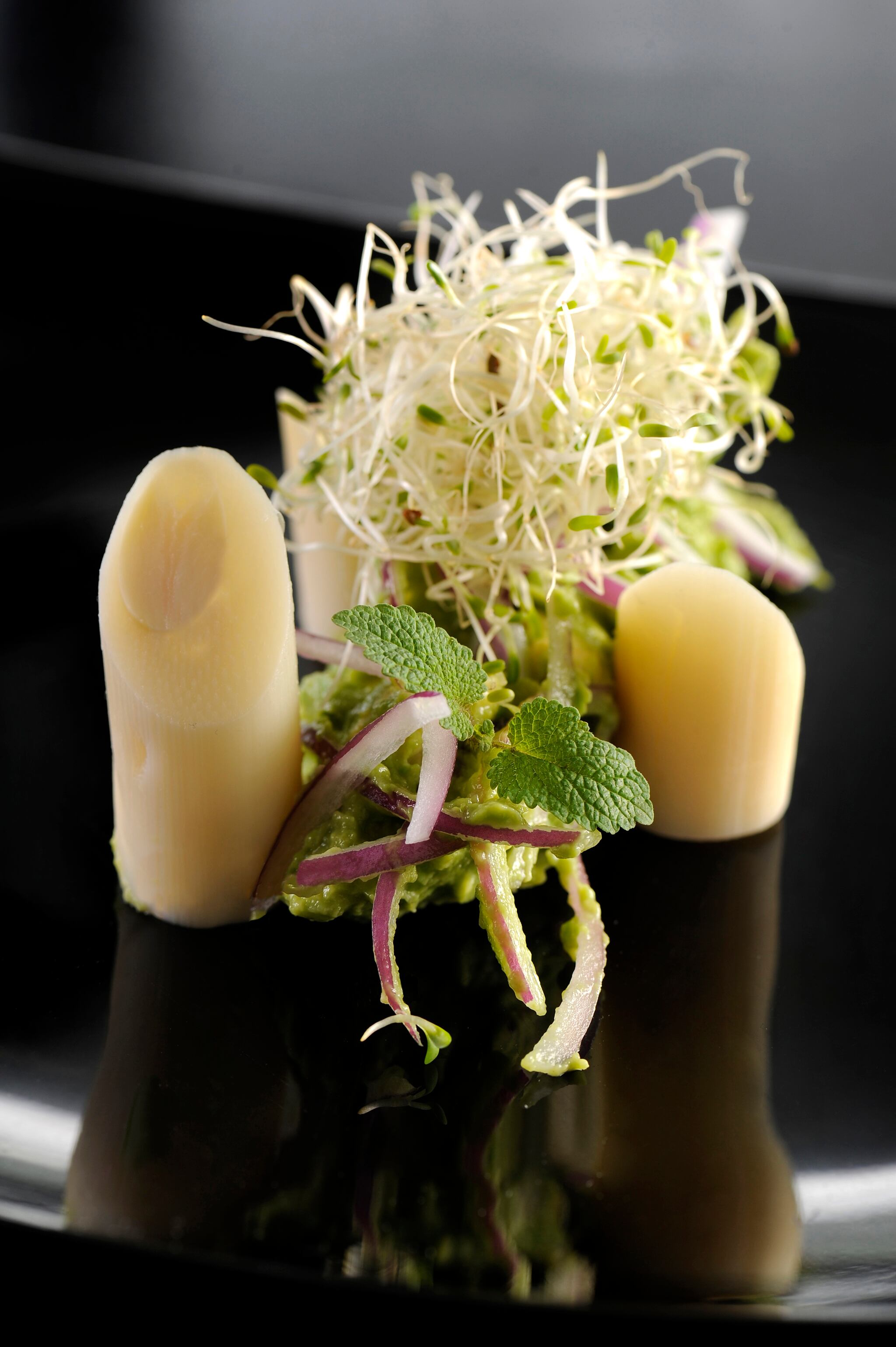 Corte los palmitos a la mitad y reserve. Retire la piel del aguacate y maje con un tenedor, corte la cebolla a lo largo, lave con agua fría y añada al aguacate. Exprima los limones en la mezcla con un poco de sal y aceite de oliva al gusto. Finalmente agregue el cilantro picado y mezcle con el palmito. Acompañe con brotes de alfalfa.