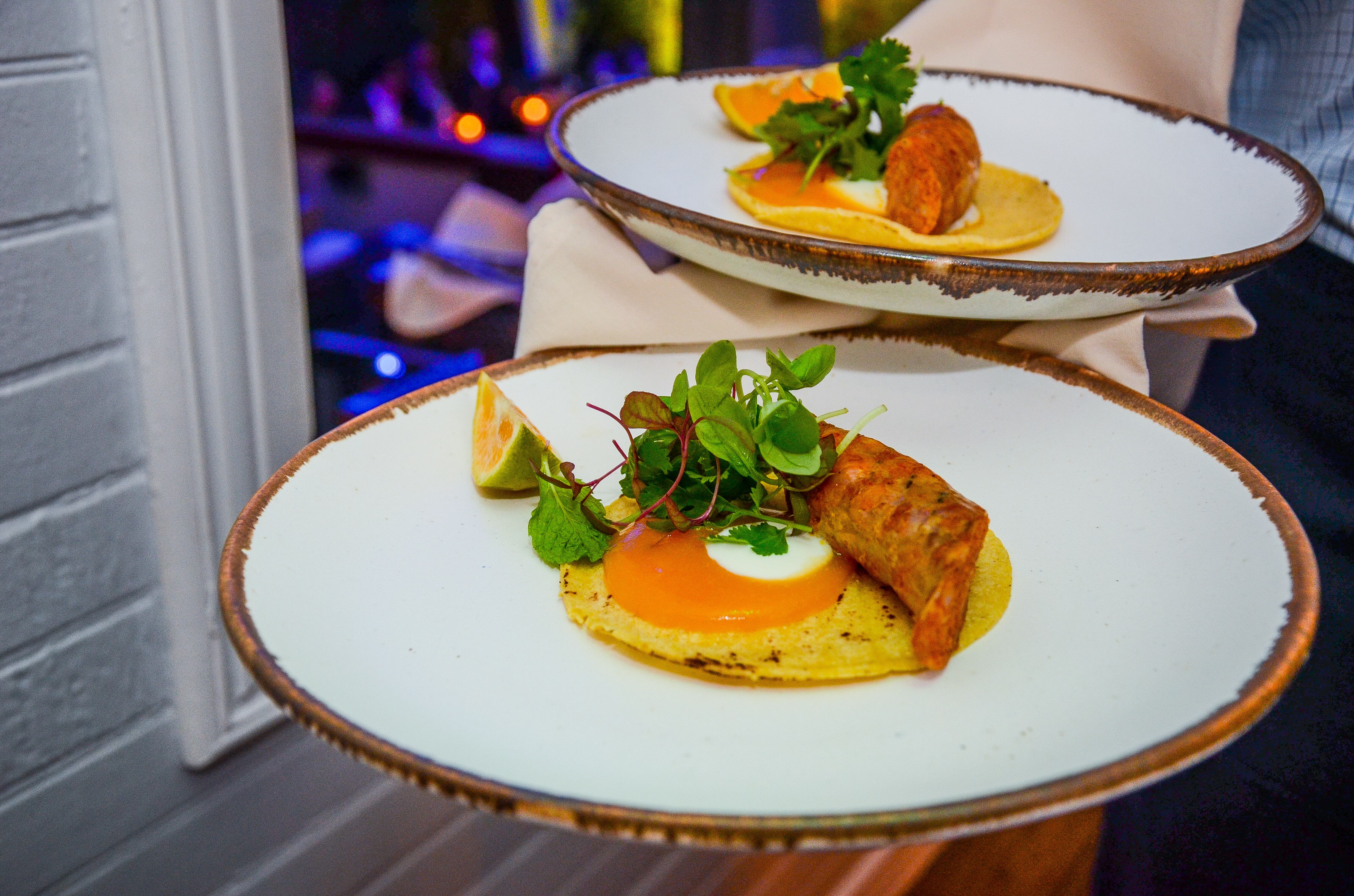Guido Tassi, el invitado especial de la noche, arribó con una alternativa ligera y delicosa: un huevo de granja, papa criolla a la parrilla y dashi de pieles. El fuerte de este chef llegó en su segundo plato, cuarto para los invitados, una salchicha parrillera casera posada sobre una reducción de tomate de árbol y ensalada de hierbas.