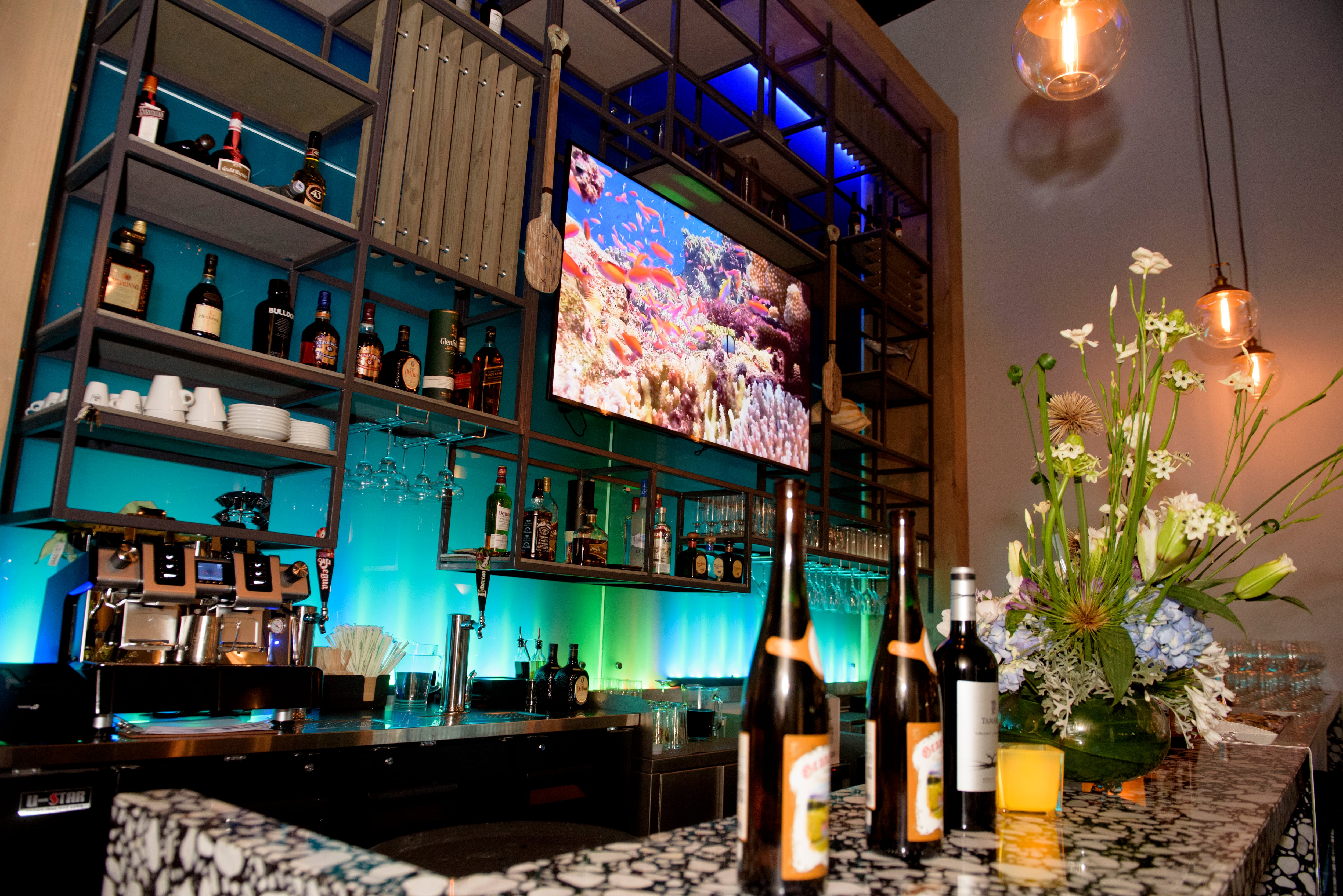 Pasando las puertas de vidrio es imposible no caminar casi en automático hasta la barra de ostras, una de sus novedades. Se trata de un espacio ubicado en el fondo el local con una pared con vidrio blandeado en tonos marinos que intenta emular el fondo del mar.