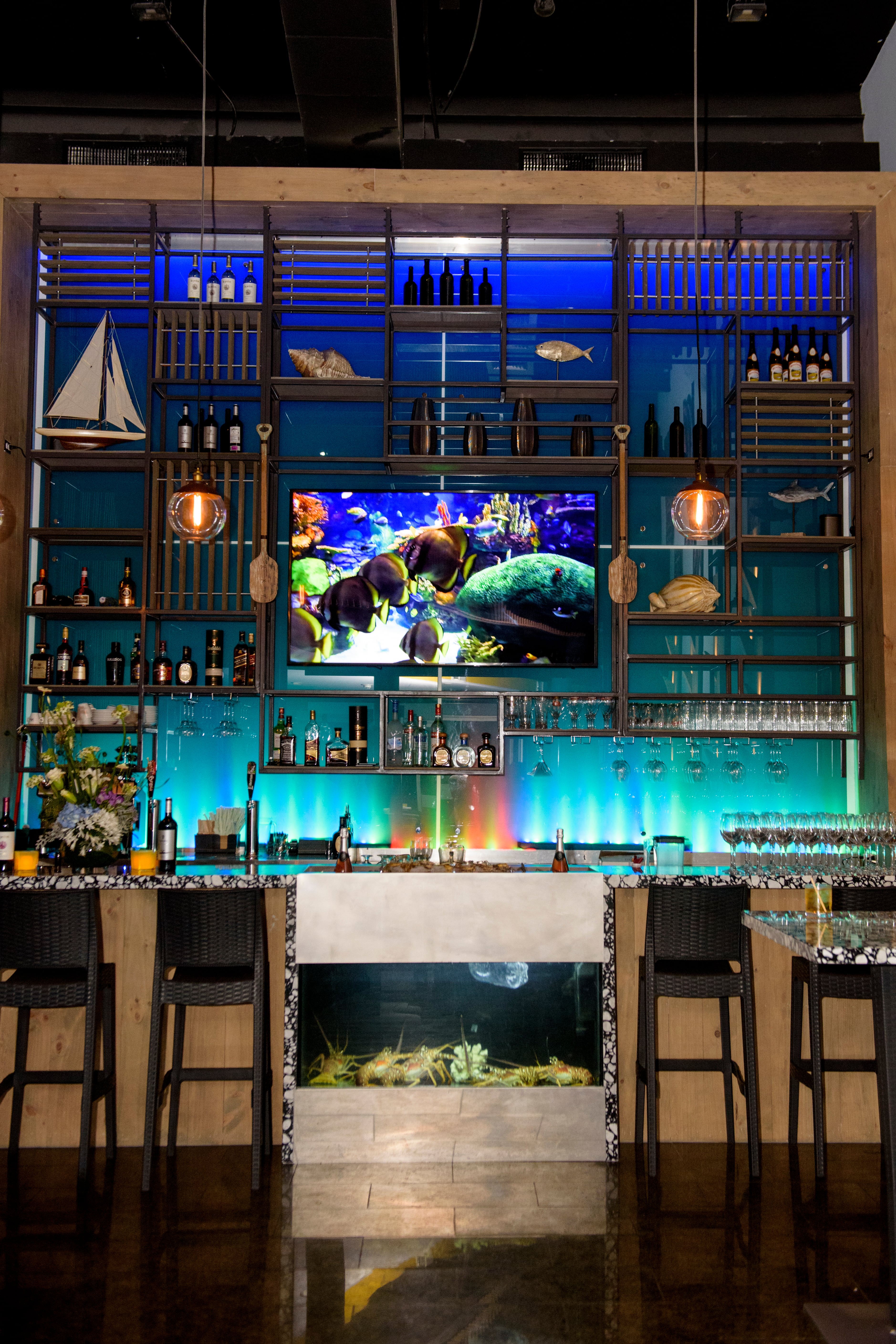 Esta barra amarra visualmente con la seguidilla de mesas altas, dando un aire más casual al espacio. Justo al frente e imposible de perder está la pecera de seis metros de largo que en definitiva agrega un aire de puerto californiano al espacio.