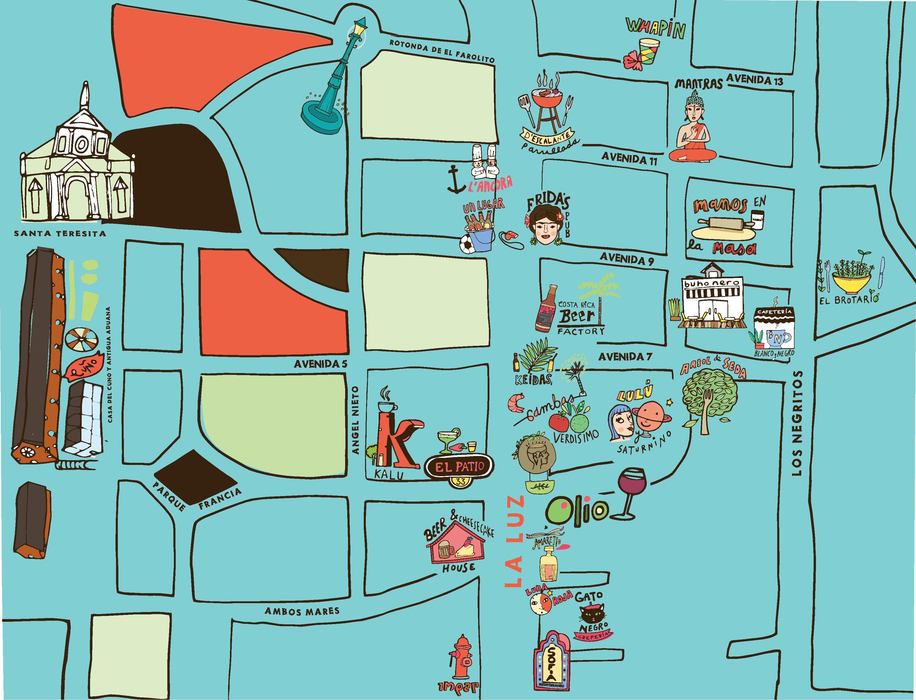 La columna vertebral de ese desarrollo urbano es el Paseo la Luz, que tomó su nombre de la pulpería —algunos dicen que era, en realidad, una cantina— que se ubicó desde los años 40 en la calle 33. No obstante en las calles aledañas de todo barrio Escalante cada vez aparecen más cafés, restaurantes, gastropubs, pizerrías o creperías. Algunos buscan conquistar a los comensales nocturnos y se especializan en cerveza artesanal, vinos, tapas o comida gourmet. Otros buscan atraen a la hora del brunch o del almuerzo. No importa si se es vegano, celiaco, o carnívoro empedernido. Barrio Escalante tiene una silla y una mesa para todos.