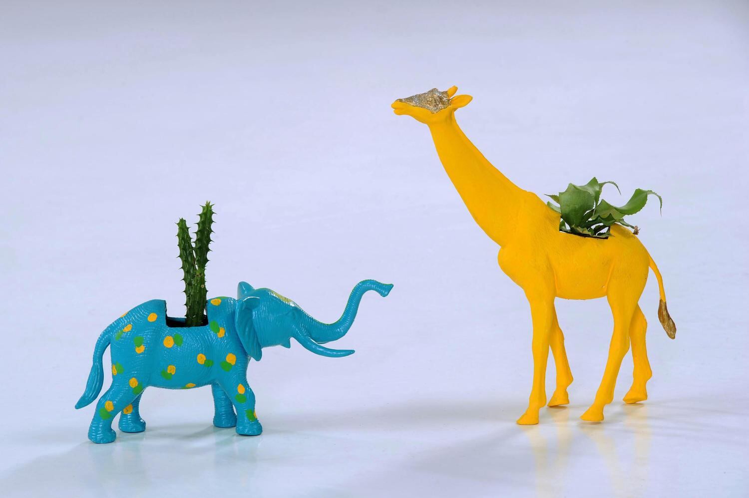 La particularidad de sus macetas, parte de un juguete de plástico y de un cactus o una suculenta. Una vez que ya tiene sus productos base, realiza un agujero en la parte de arriba del juguete -lugar donde va colocada la planta- y otro agujero en la parte de abajo para que pueda drenar el agua. Después del proceso principal, los decora con pinturas aclíricas de acuerdo a los colores o detalles específicos que le soliciten.