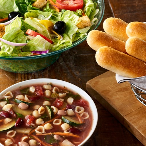 Las sopas, breadsticks y ensaladas ilimitadas son una insignia del restaurante. Puede elegir entre la Zuppa Toscana (mi favorita), la Minestrone con vegetales frescos o la de pollo y gnocchi.