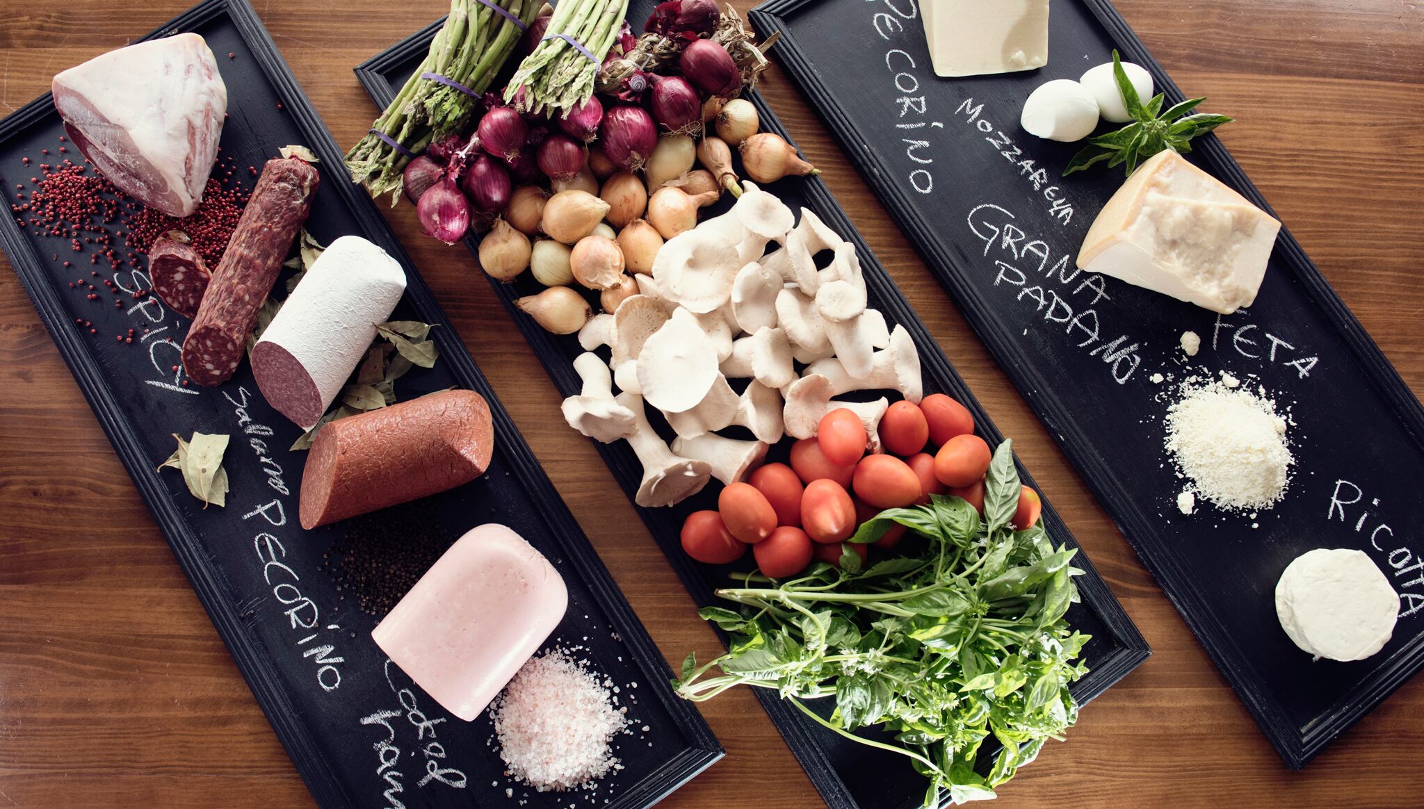 1. Cuatro estaciones: queso mozzarella, tomate, jamón, hongos ostras, tomate cherry, alcachofas, aceitunas negras y hojas verdes frescas.