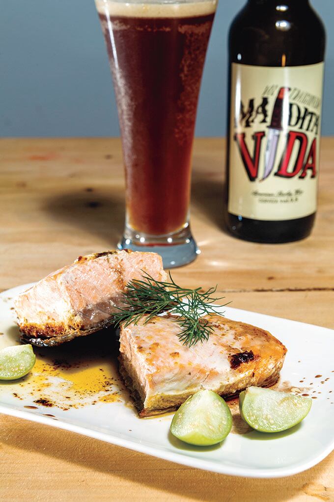 - Maridaje: Cerveza estilo Barley Wine. El sabor característico del salmón; fuerte y graso, se acompaña con el sabor fuerte a melaza de las maltas tostadas de la cerveza estilo Barley Wine, obtendrá en boca sabores apreciables de cada uno de los elementos tanto del plato cómo de la cerveza. Este salmón se combinó con la cerveza artesanal “Maldita vida”, que contiene 9.8% de alcohol.