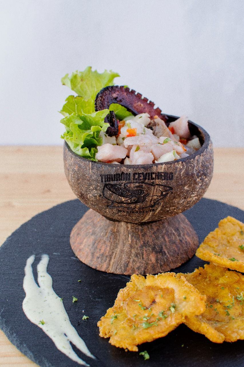 Ceviches, arroces, sopas, caldosas, pulpos, langostas, colas de langostas, filetes y creaciones originales como el Chifrimar y las Papas Tiburón son tan solo algunas de las opciones que forman parte del menú de El Tiburón Cevichero.