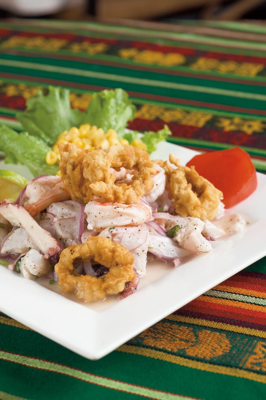 En un plato, ponga la hoja de lechuga y sobre esta, el ceviche y los calamares fritos. Acompañe con camote y maíz.