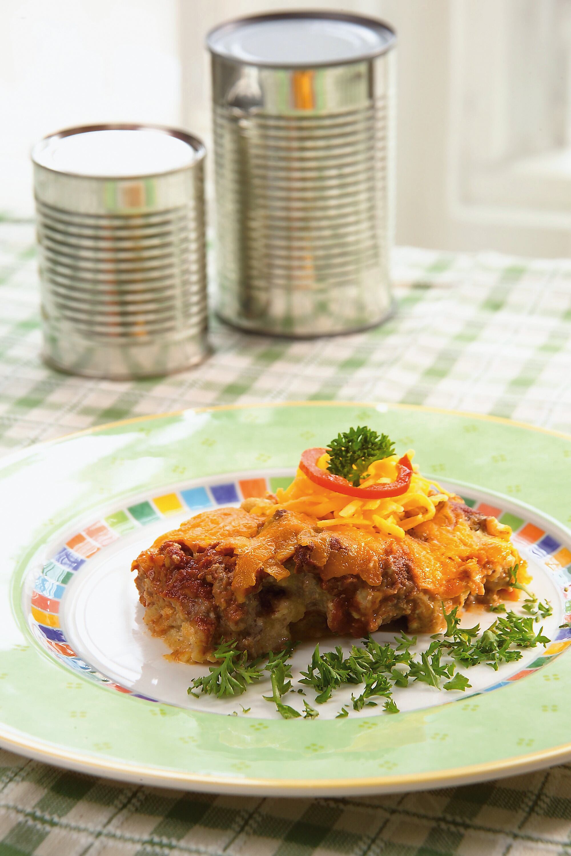 4. Cubra con la carne, luego la salsa, la crema dulce y el queso.