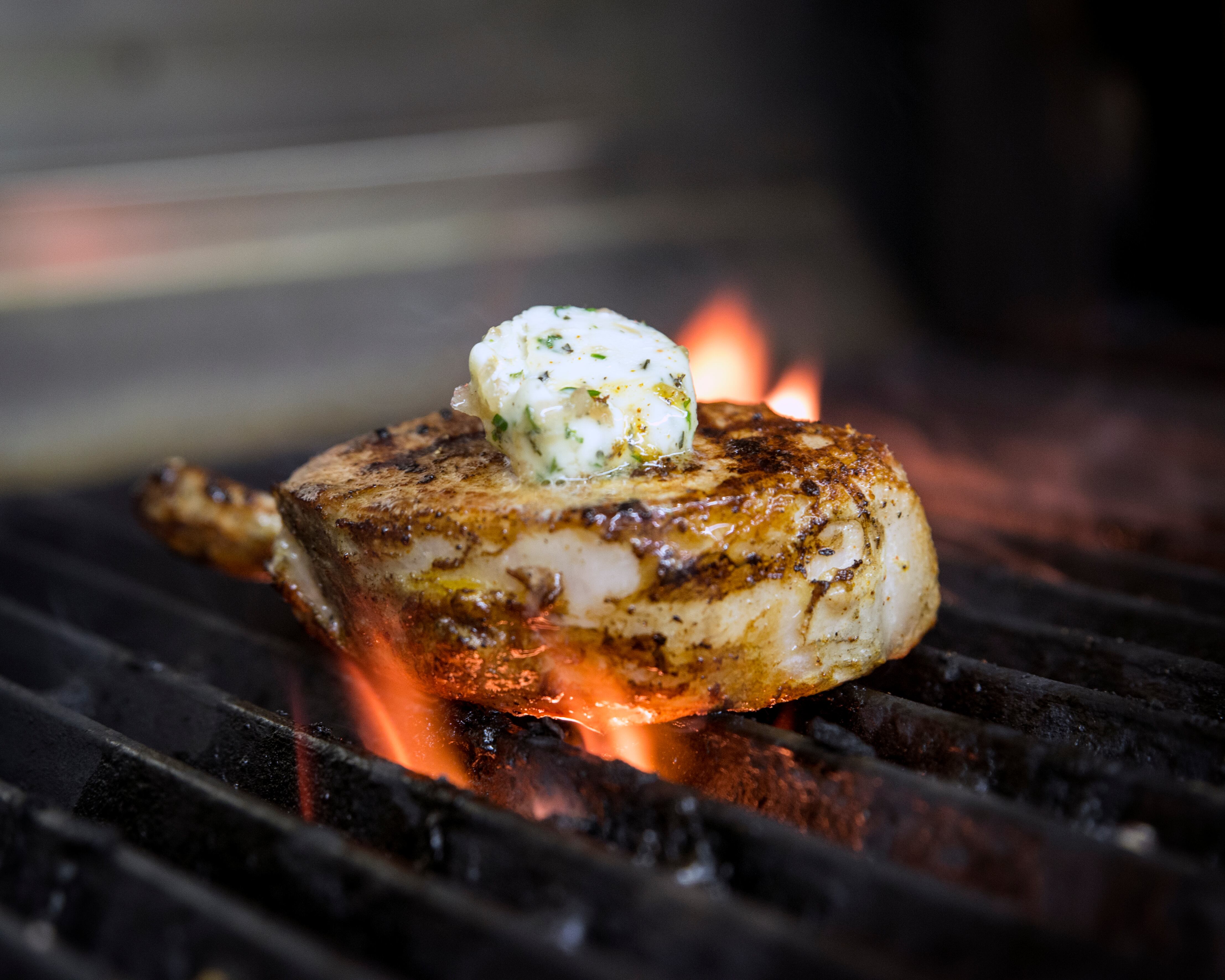 Caliente la parrilla a fuego alto o grill. Agregue la carne de cerdo y cocine, volteándola ocasionalmente, hasta que esté bien caramelizada por ambos lados, aproximadamente 4 minutos en total coloque la carne de cerdo en un plato para que descanse la carne mientras se cocina la carne de cerdo, puede preparar la salsa picante de manzana y la mantequilla de hierbas.