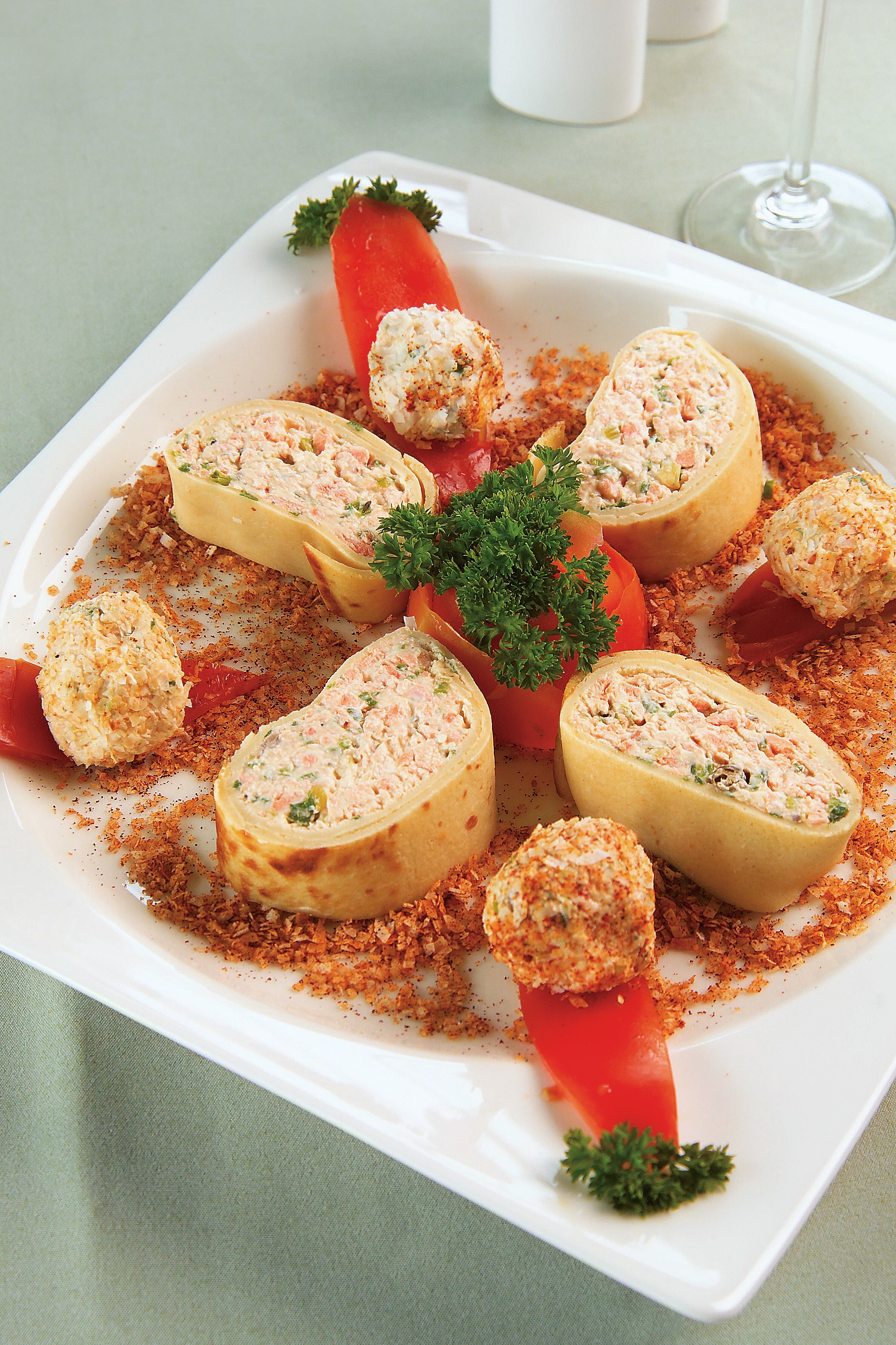 Rellene las crepas con la pasta de salmón, enrrolle y corte diagonalmente. Acompañe con ensalada fresca al gusto.