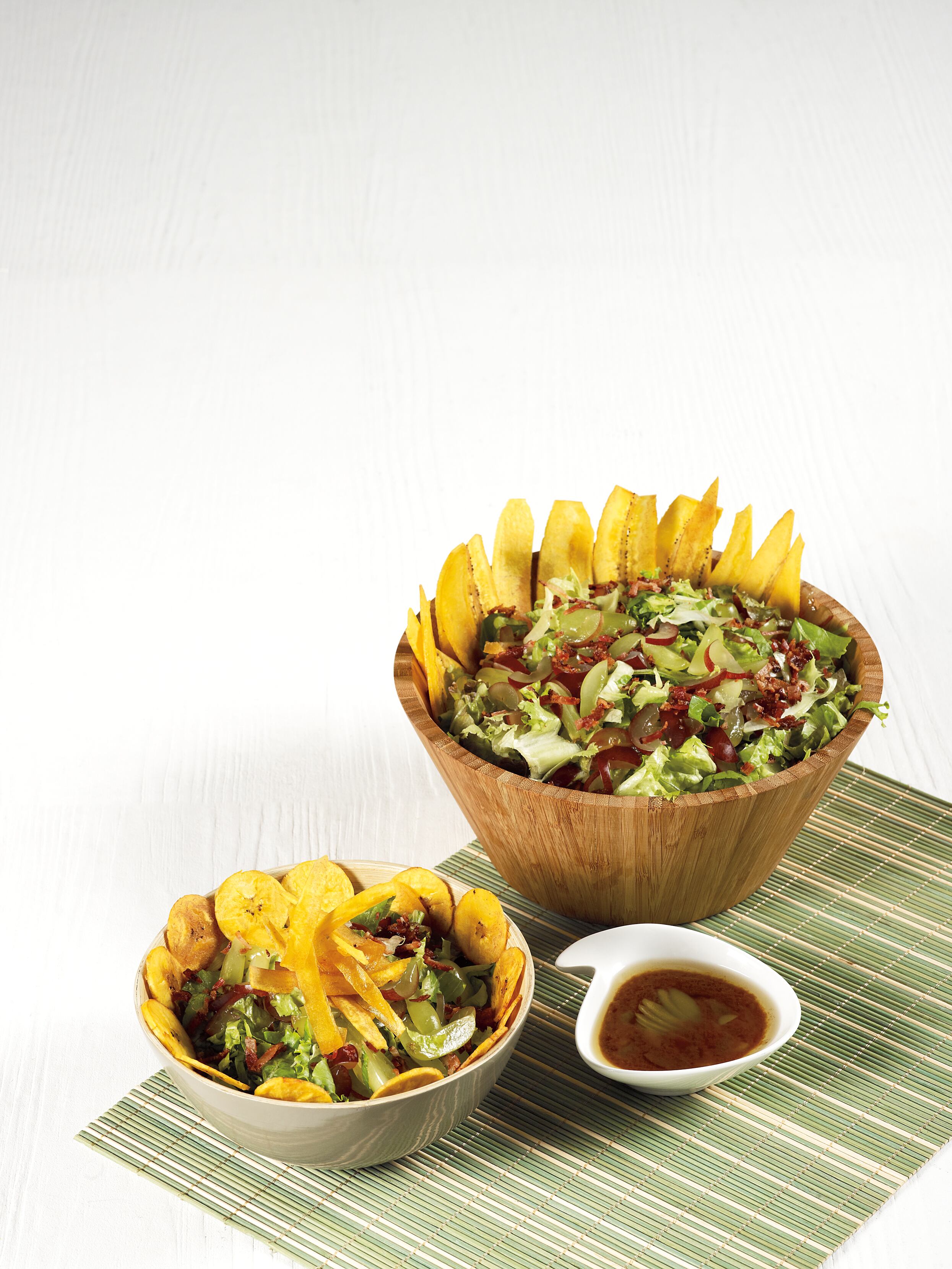 2. En un tazón, mezcle la lechuga, las uvas y la tocineta. Al final, adicione los chips de plátano.
