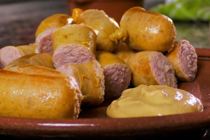 4. En una olla con agua caliente, coloque las salchichas (el agua no debe hervir). Cocine por 40 minutos.