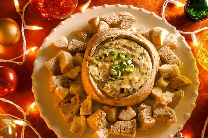 Corte un círculo en el centro del pan redondo sin abrir el fondo y retire el relleno o la miga de pan. Esta miga puede cortarla en cubos para acompañar el dip.