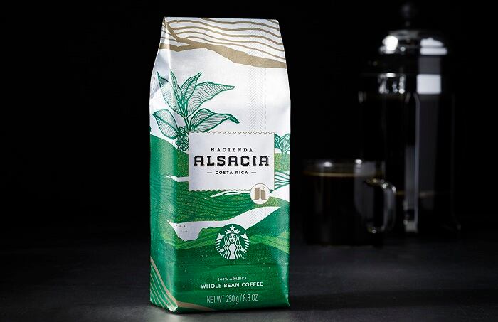 El empaque del Café Starbucks Hacienda Alsacia también rinde homenaje a Costa Rica, ya que se inspira en las hermosas hileras de café de la Hacienda Alsacia.