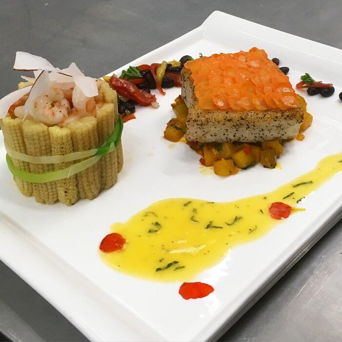 El resultado fue un marlin cocinado con escamas de zanahoria junto a una corona de elotitos, rellena de puré de pejibaye, y camarones con coco encima. Los acompañó con una ensalada de frijoles negro con mango, piña y otras especias.