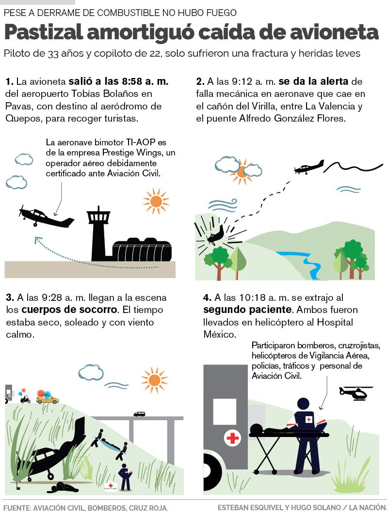 La aeronave, matrícula TI-AOP, es una Piper PA-34-200T Séneca II, propiedad de la empresa Prestige Wings, según informó Guillermo Hoppe, director de Aviación Civil.