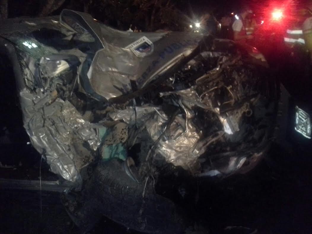 Por razones que se investigan el carro policial perdió el control y se fue contra un árbol por lo que la parte delantera de la patrulla quedó totalmente destruida.