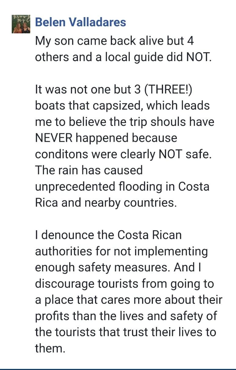 “Denuncio a las autoridades costarricenses por no implementar suficientes medidas de seguridad. Quiero disuadir a todos los turistas de que visiten lugares que les importe más su rentabilidad que la vida y la seguridad,” advirtió Valladares.